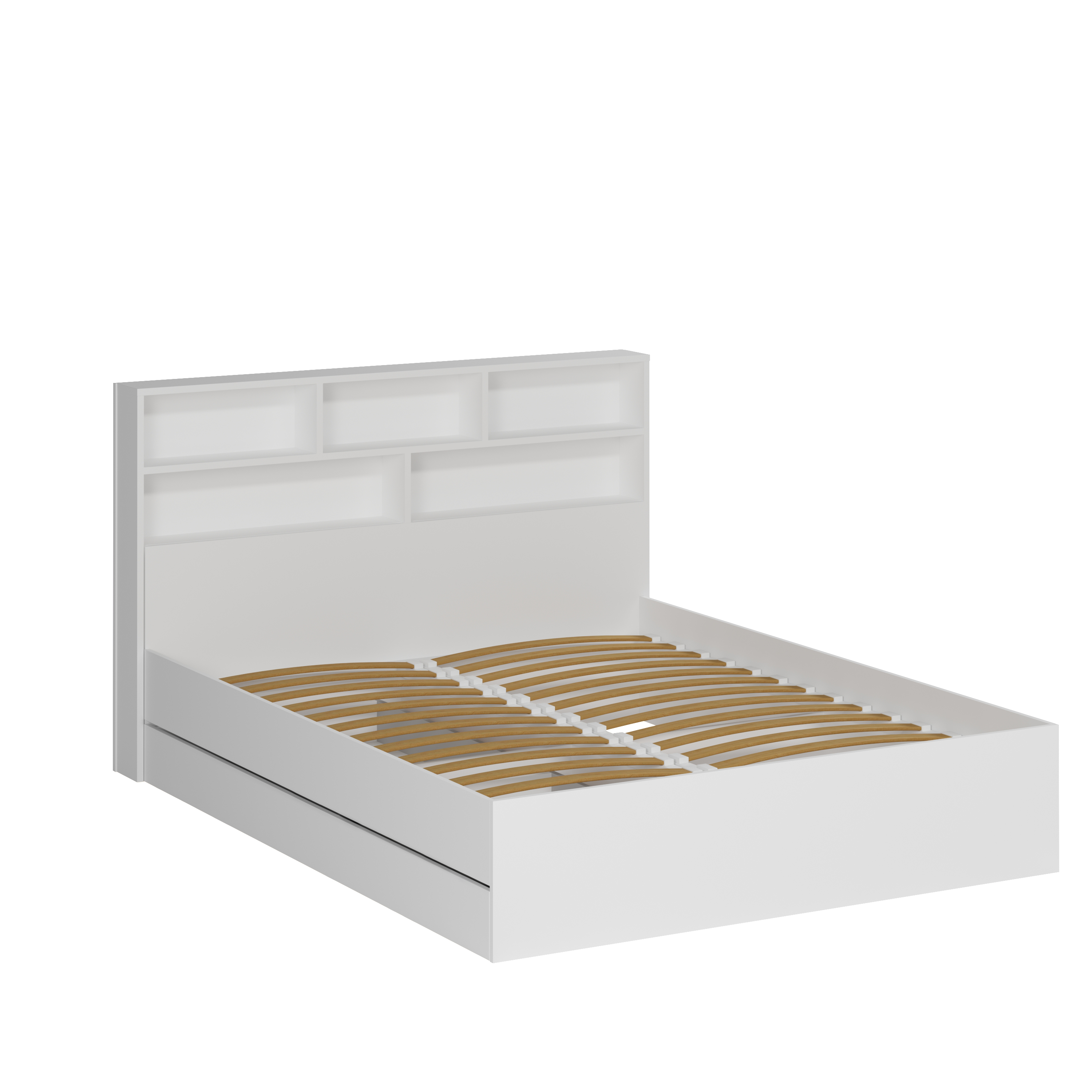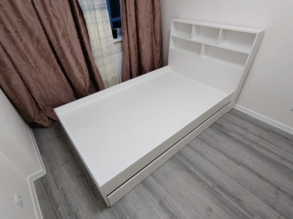 В кровать встроен выдвижной полновыкатной ящик на выкатных роликах.