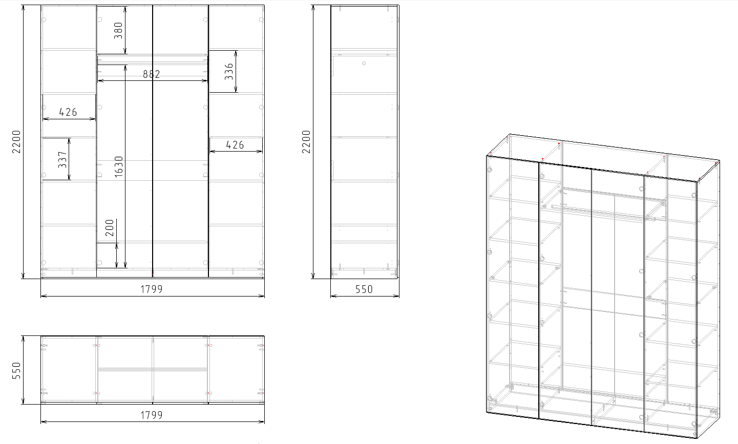 Шкаф имеет четыре распашные двери, которые оснащены доводчиками для плавного и бесшумного закрывания.