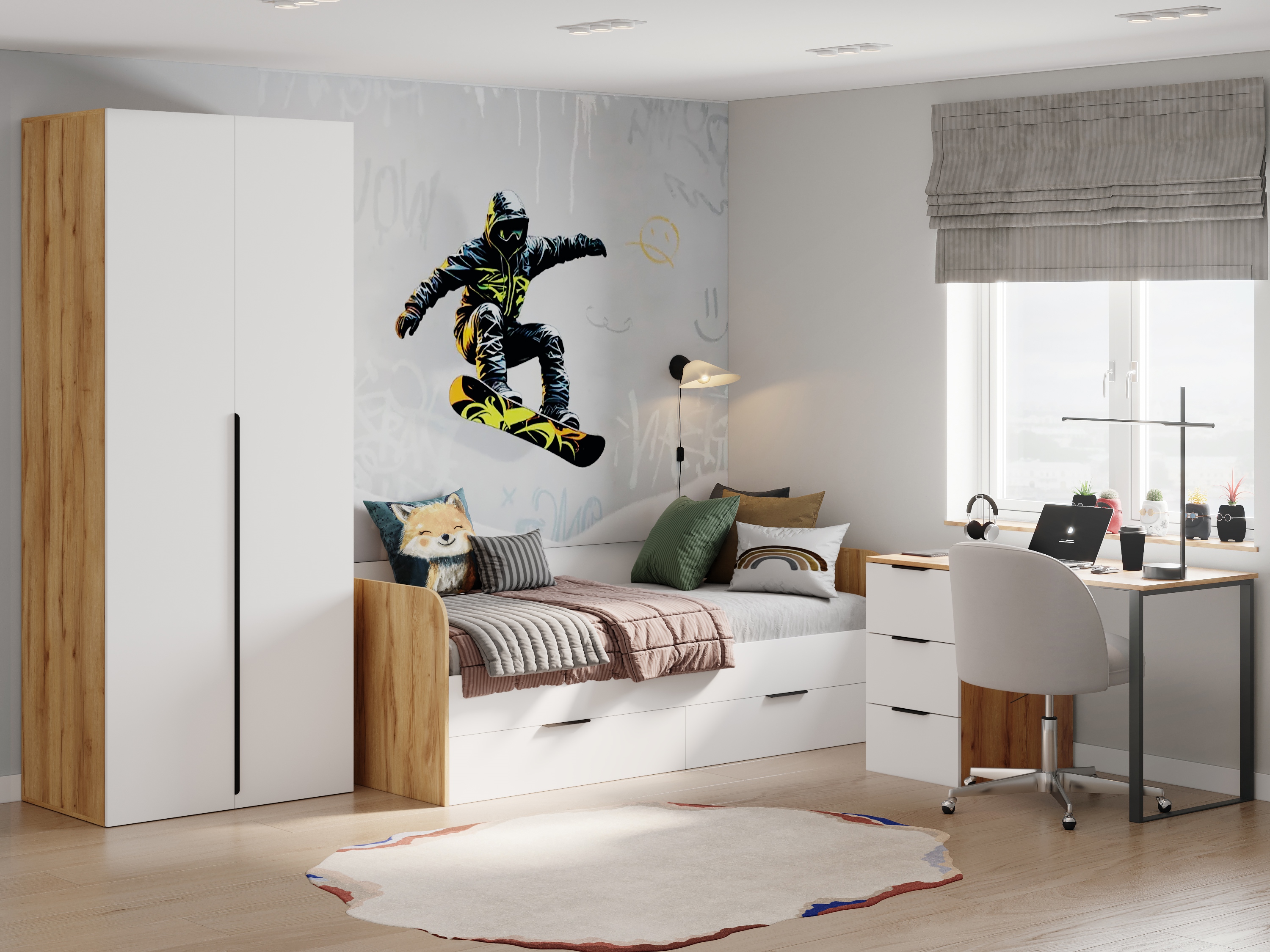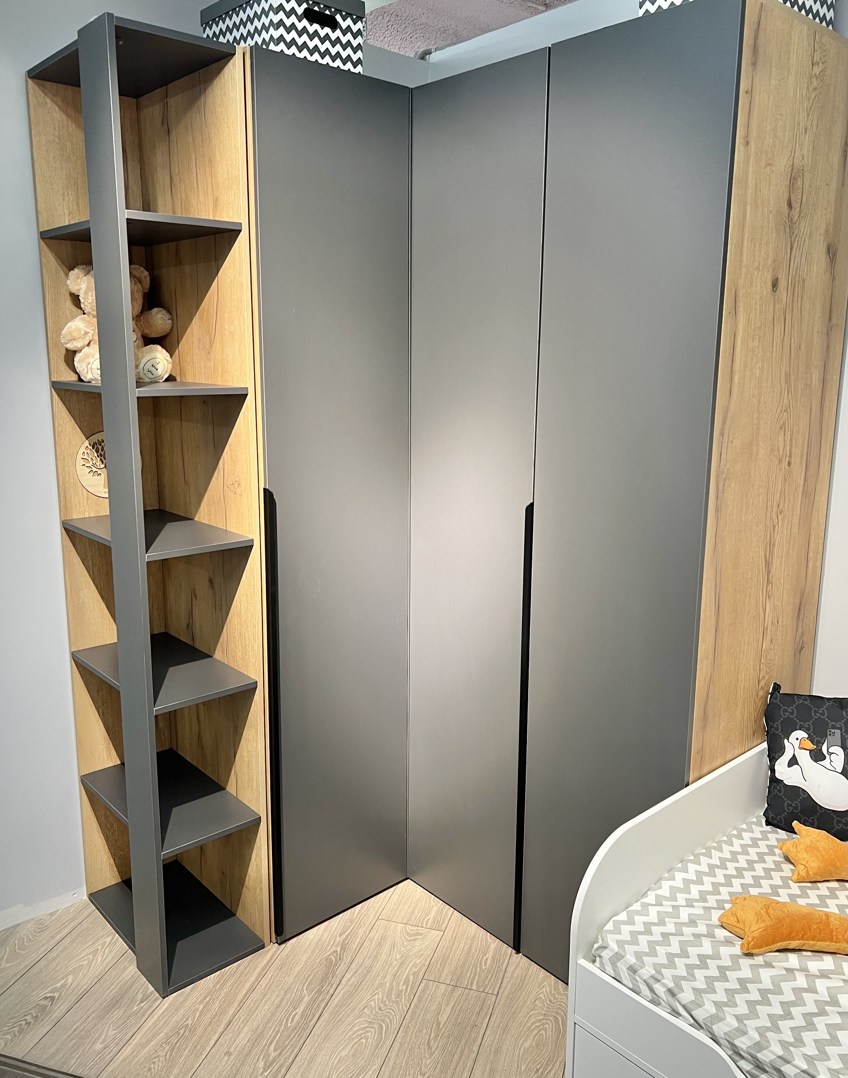 корпус дуб золотистый + фасады графит, корпус дуб золотистый + фасады белые, корпус белый + фасады графит, полностью белый или полностью велюр