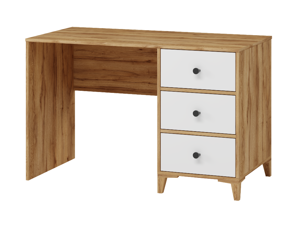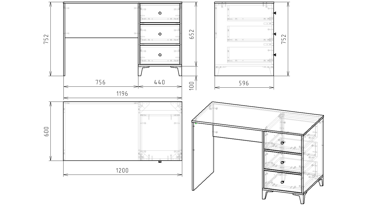 В стол встроены три выдвижных ящика на направляющих скрытого монтажа с ДОВОДЧИКАМИ.
