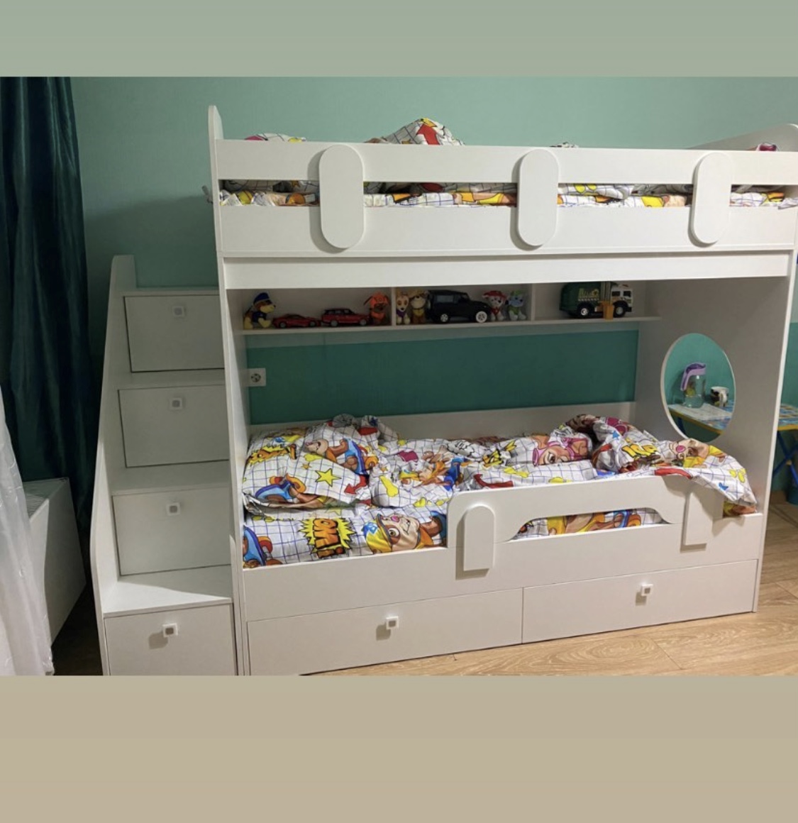 Два выдвижных ящика нижней кровати с крепким дном из ЛДСП выдерживают нагрузку до 45 кг.