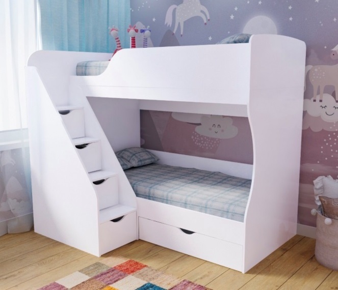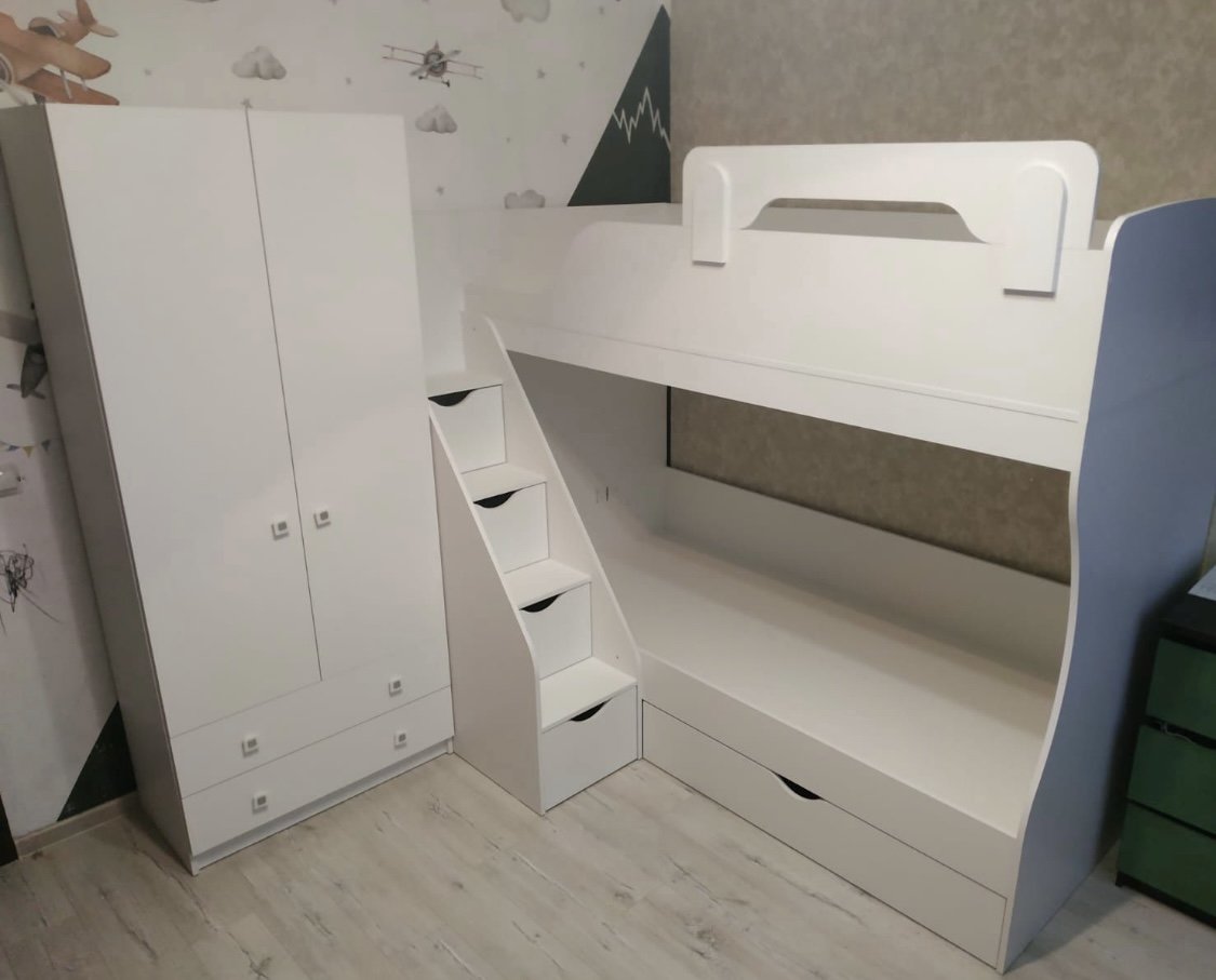 Преимущества данной модели - удобная, безопасная лестница с ящиками для игрушек и комфортная высота кровати.