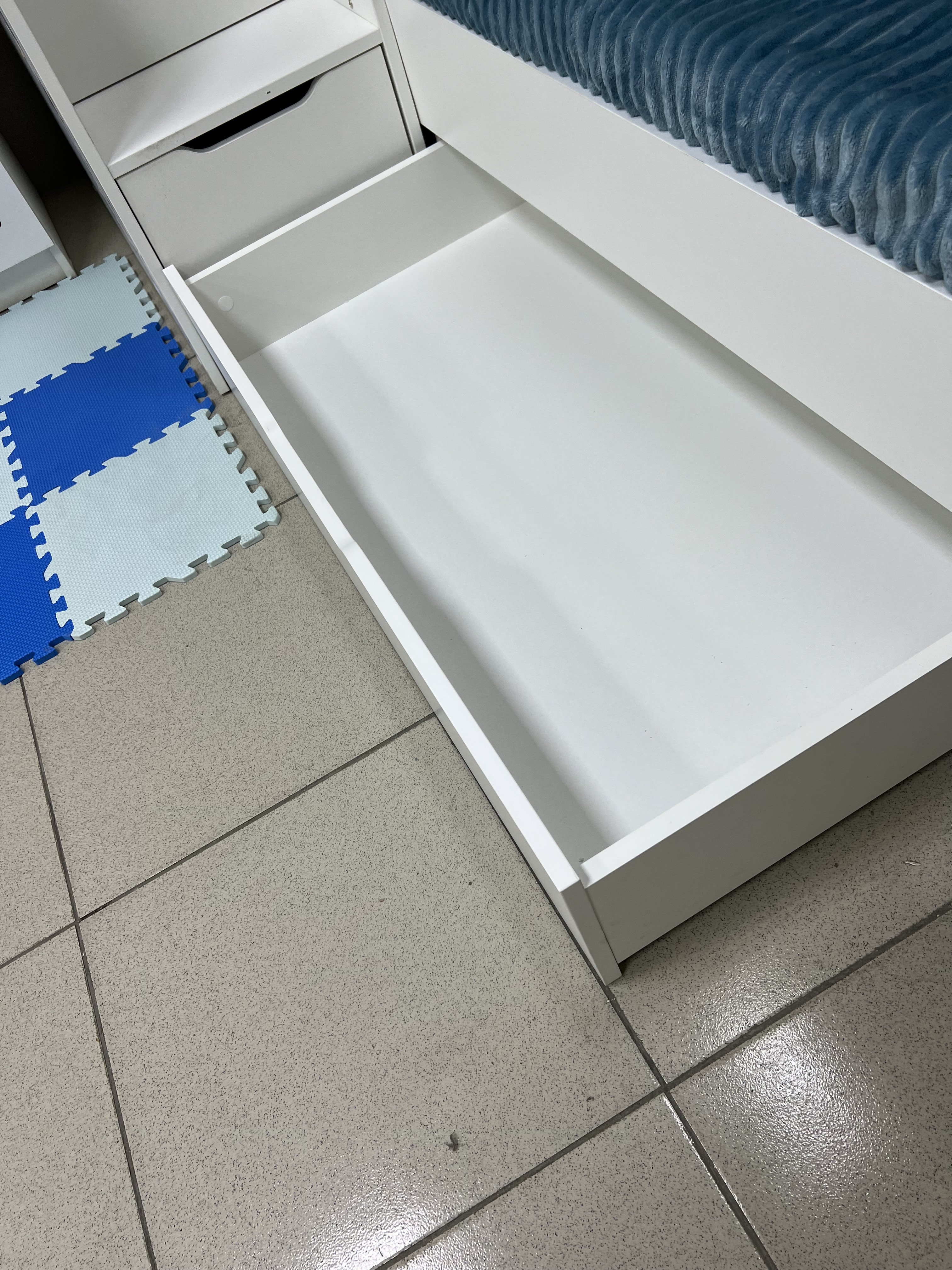 В нижнюю кровать встроен выдвижной ящик для белья и игрушек.
