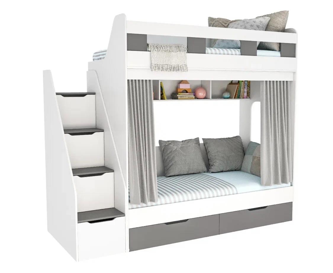 Прочная, стильная двухъярусная кровать Твинс с удобной лестницей, безопасным высоким бортиком и ящиками для хранения.
