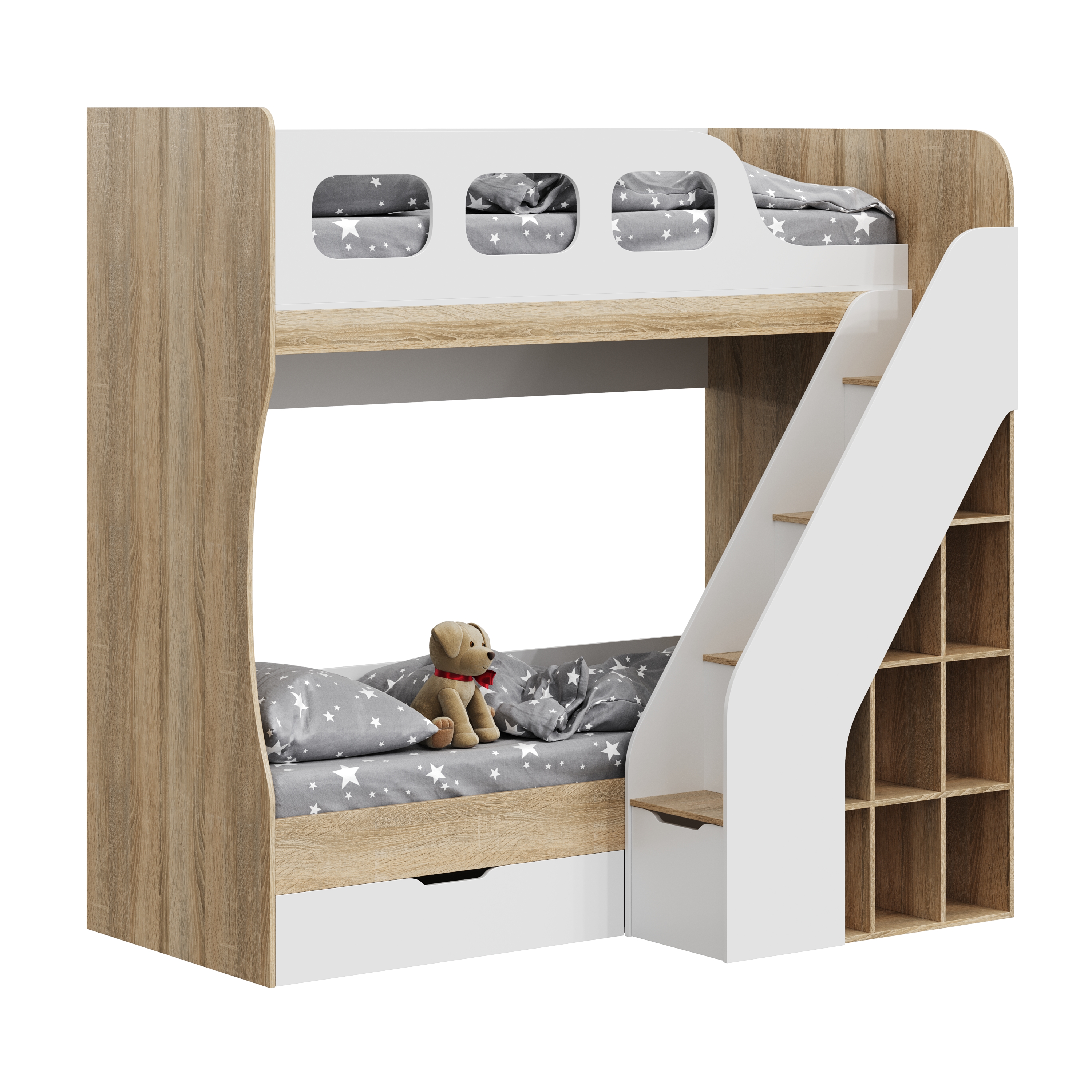 В нижнюю кровать встроен выдвижной ящик для белья и игрушек.