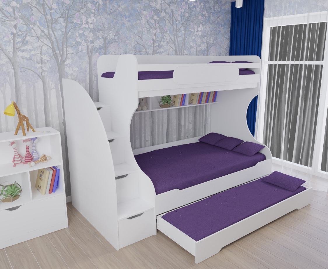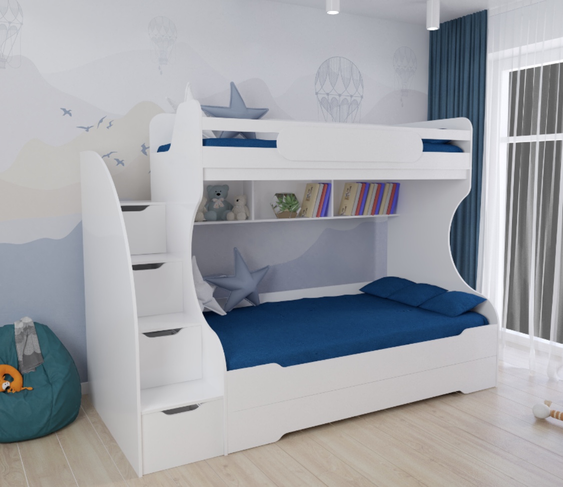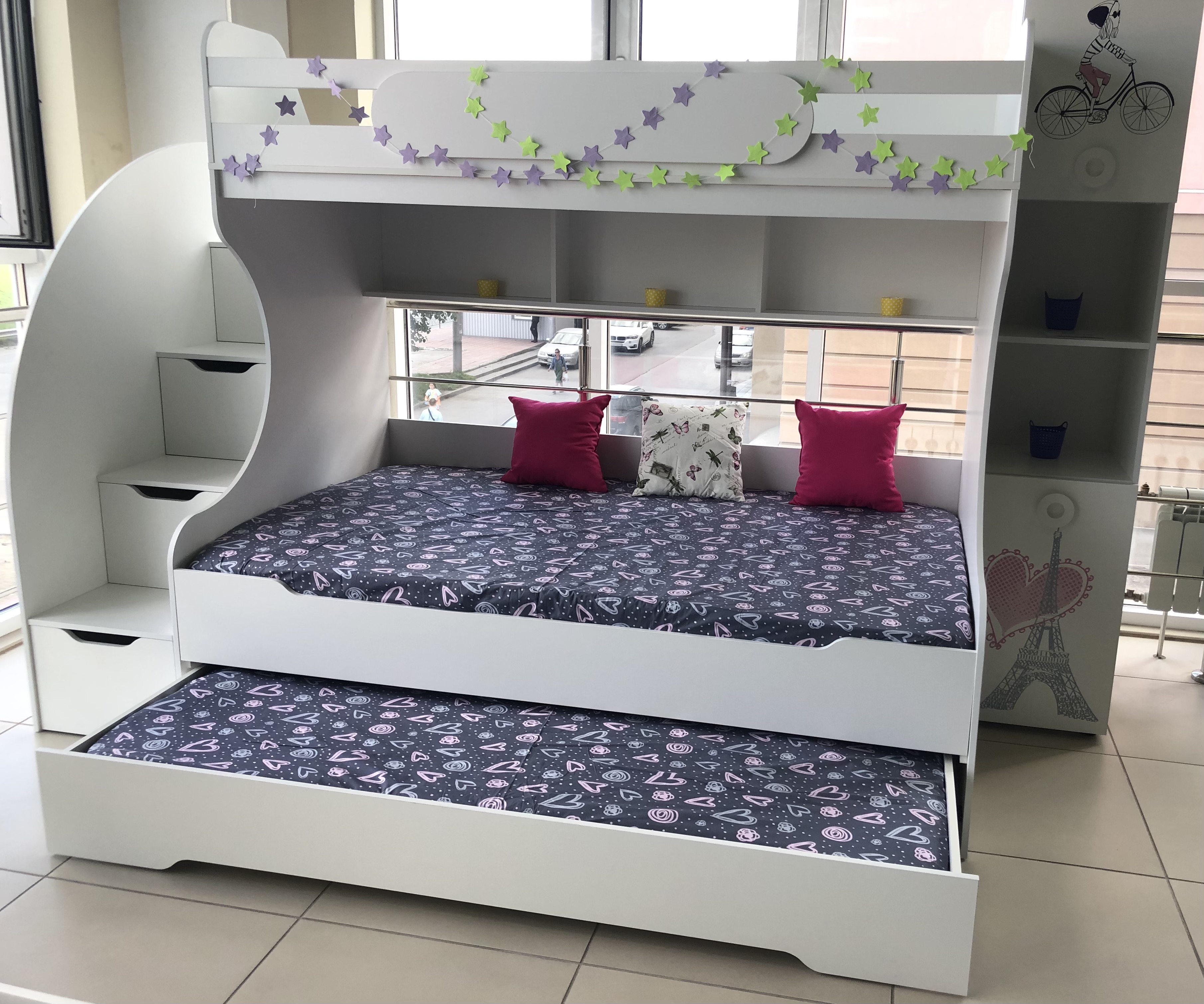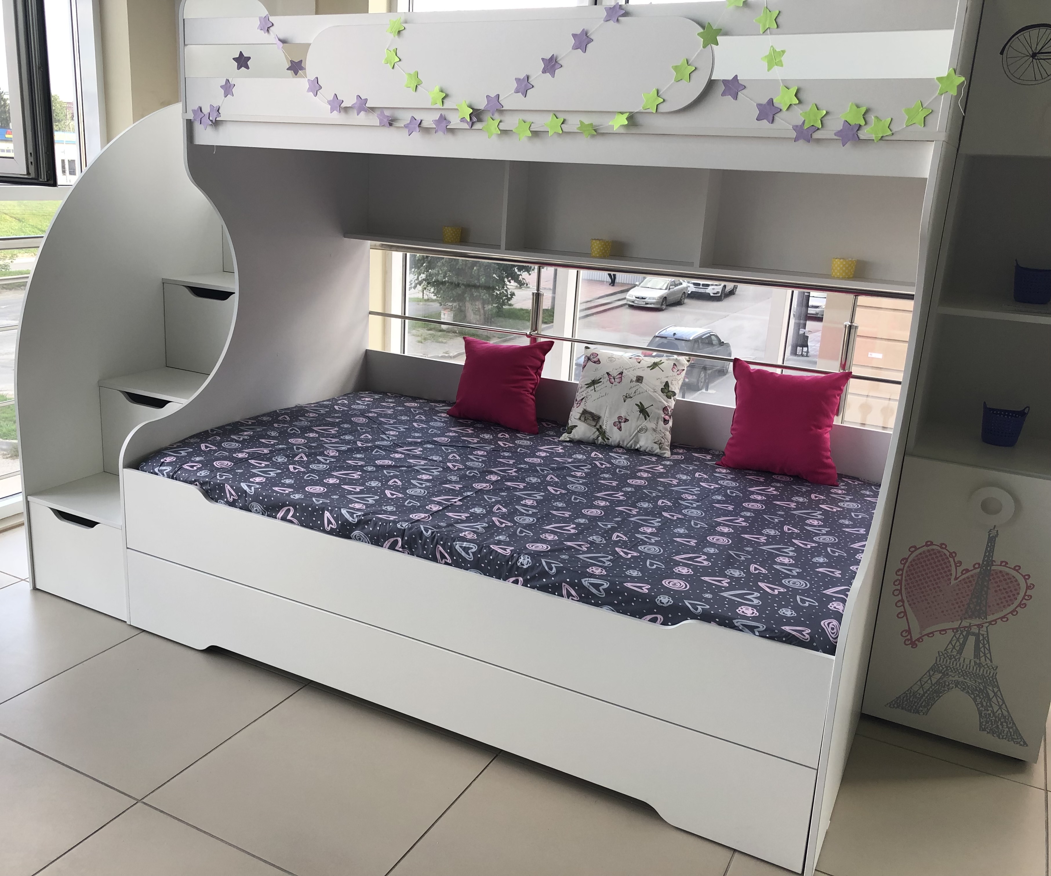 Увеличенное, просторное нижнее спальное место позволяет комфортно разместиться ребенку вместе со взрослым.