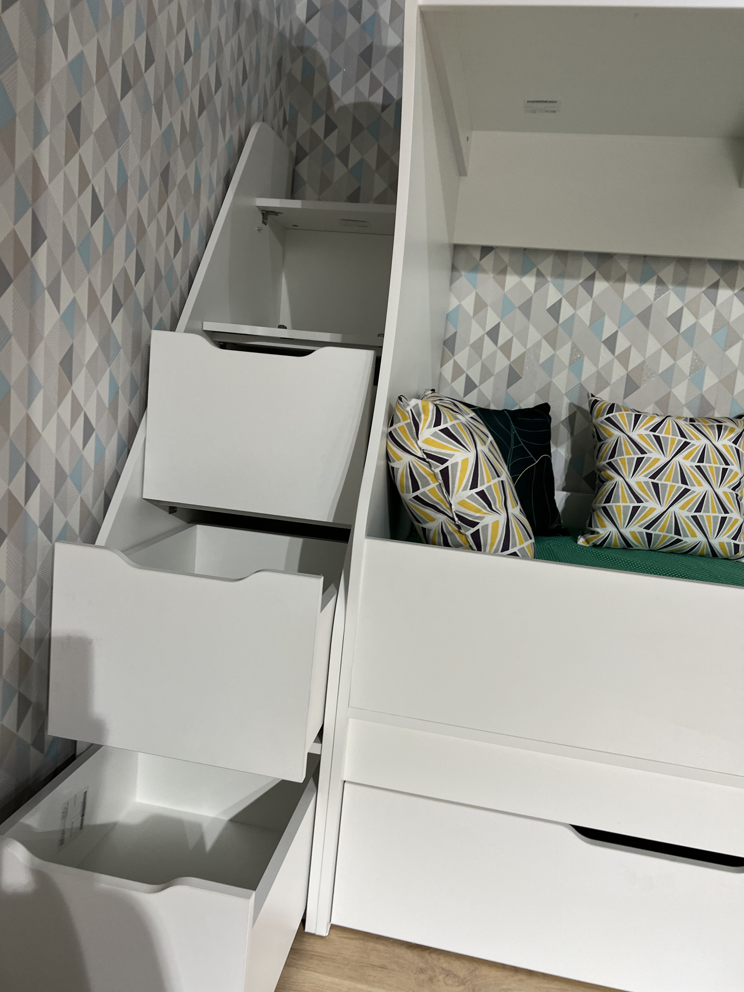 Кровать имеет также два выдвижных ящика для хранения белья или игрушек (ящики на выкатных роликах).