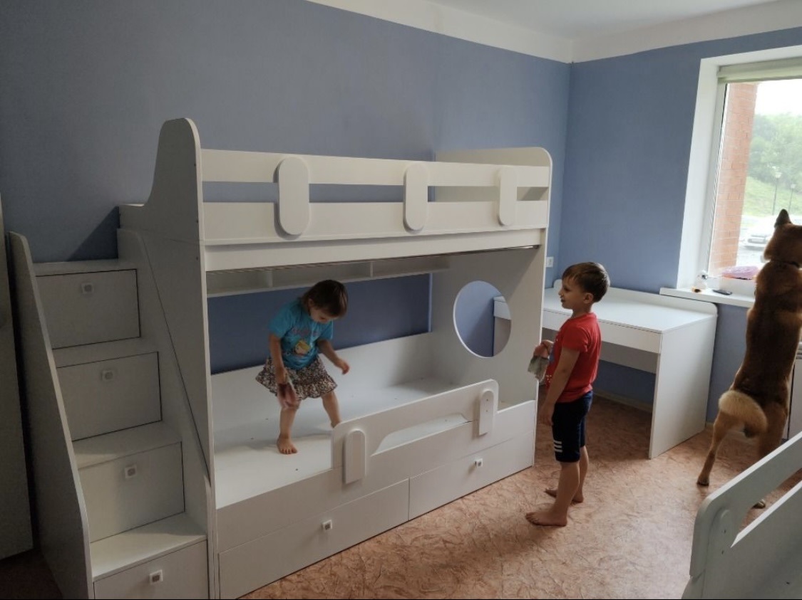 Два выдвижных ящика нижней кровати с прочным дном из ЛДСП 16 мм (не ДВП, не ХДФ!) выдерживают нагрузку до 45 кг.