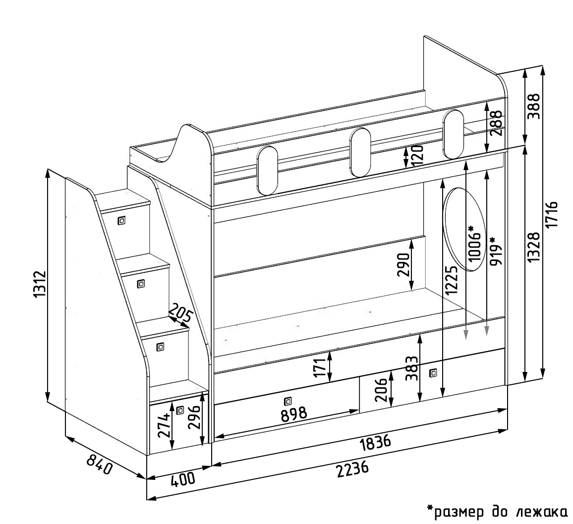 Габариты кровати с учетом лестницы: ширина 2236 х высота 1716 х глубина 840 мм