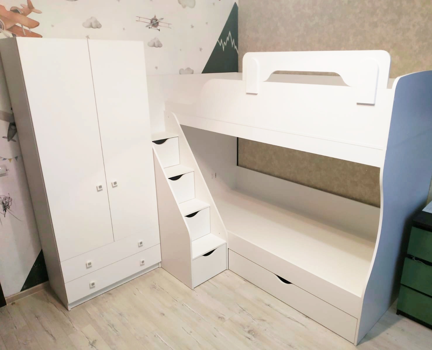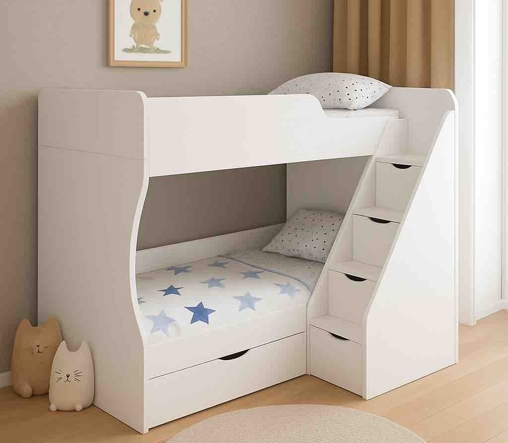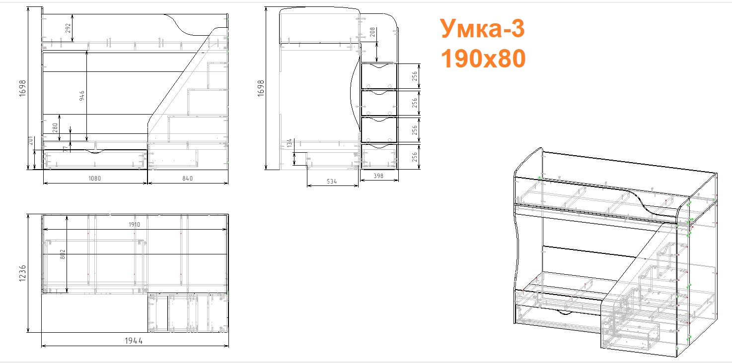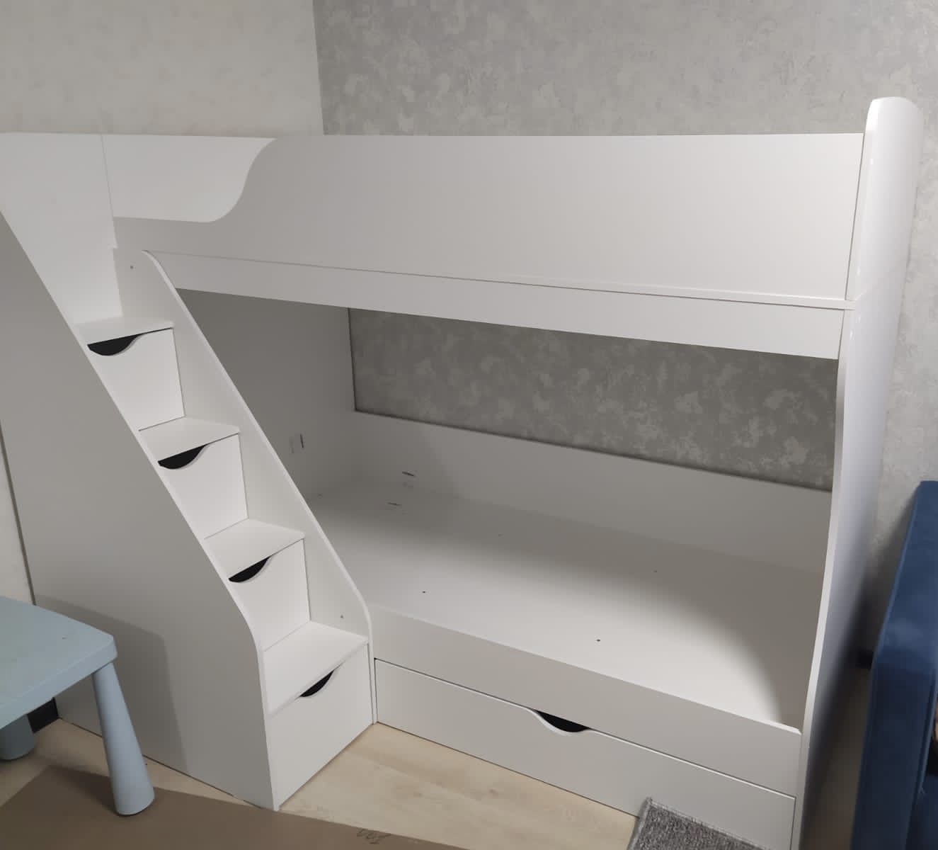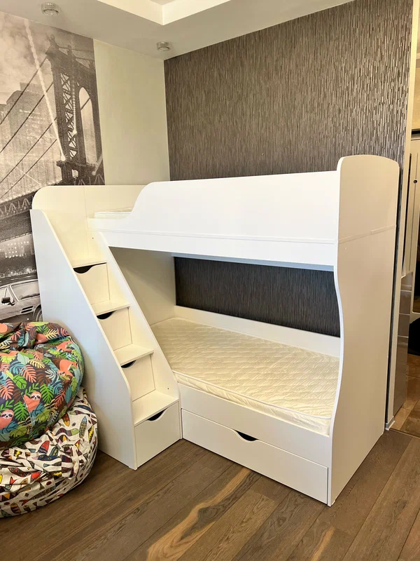 Высокая нагрузка на спальные места. Удобная лестница с ящиками. Высокий, прочный борт |