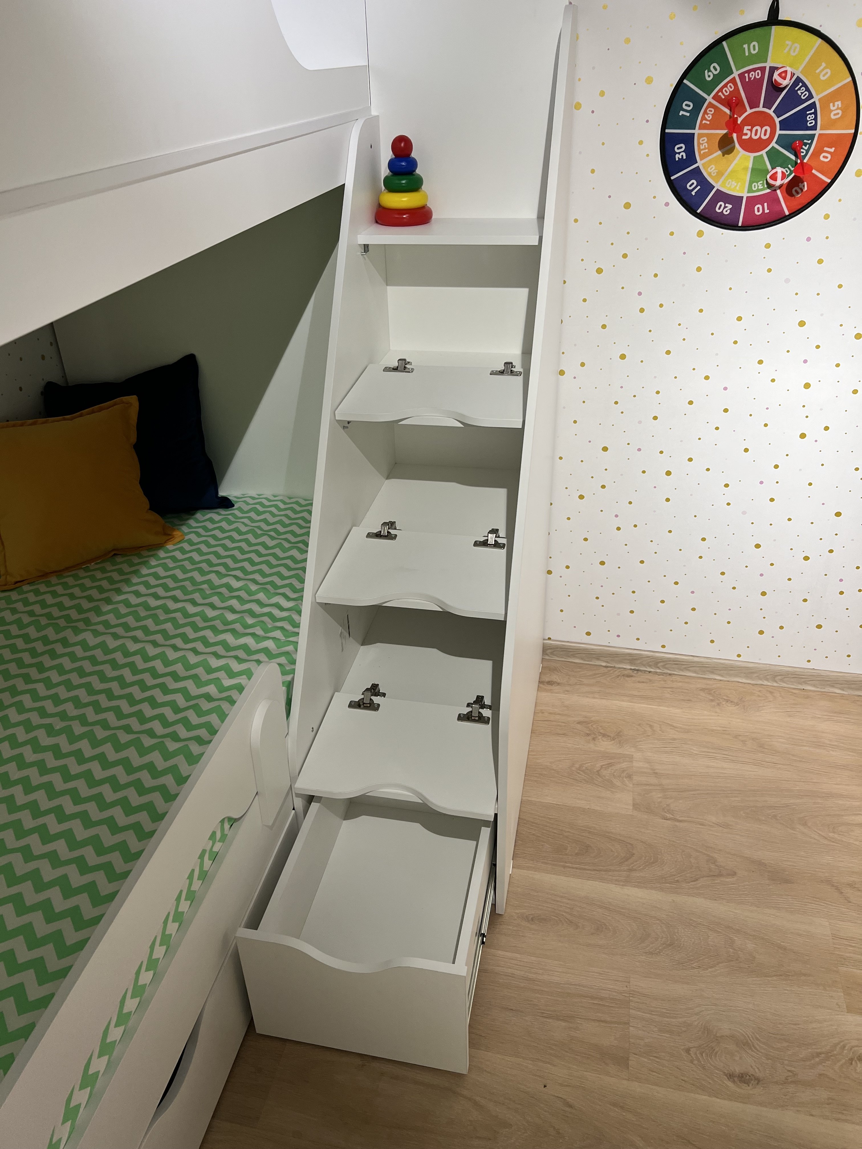 Преимущества данной модели - компактность и удобная, безопасная лестница с ящиками для игрушек и комфортная высота кровати.
