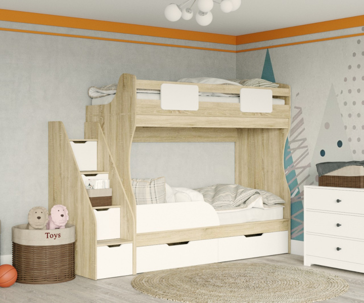 Корпус кровати в цвете "дуб сонома" добавит в интерьер природные мотивы, а белые фасады придадут помещению легкости.