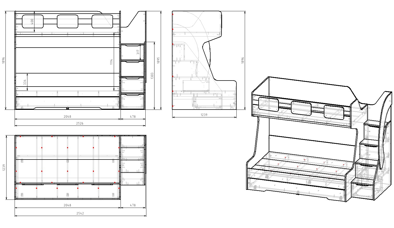 Габариты кровати: ширина с учетом лестницы 2542, глубина 1239, высота 1896 мм