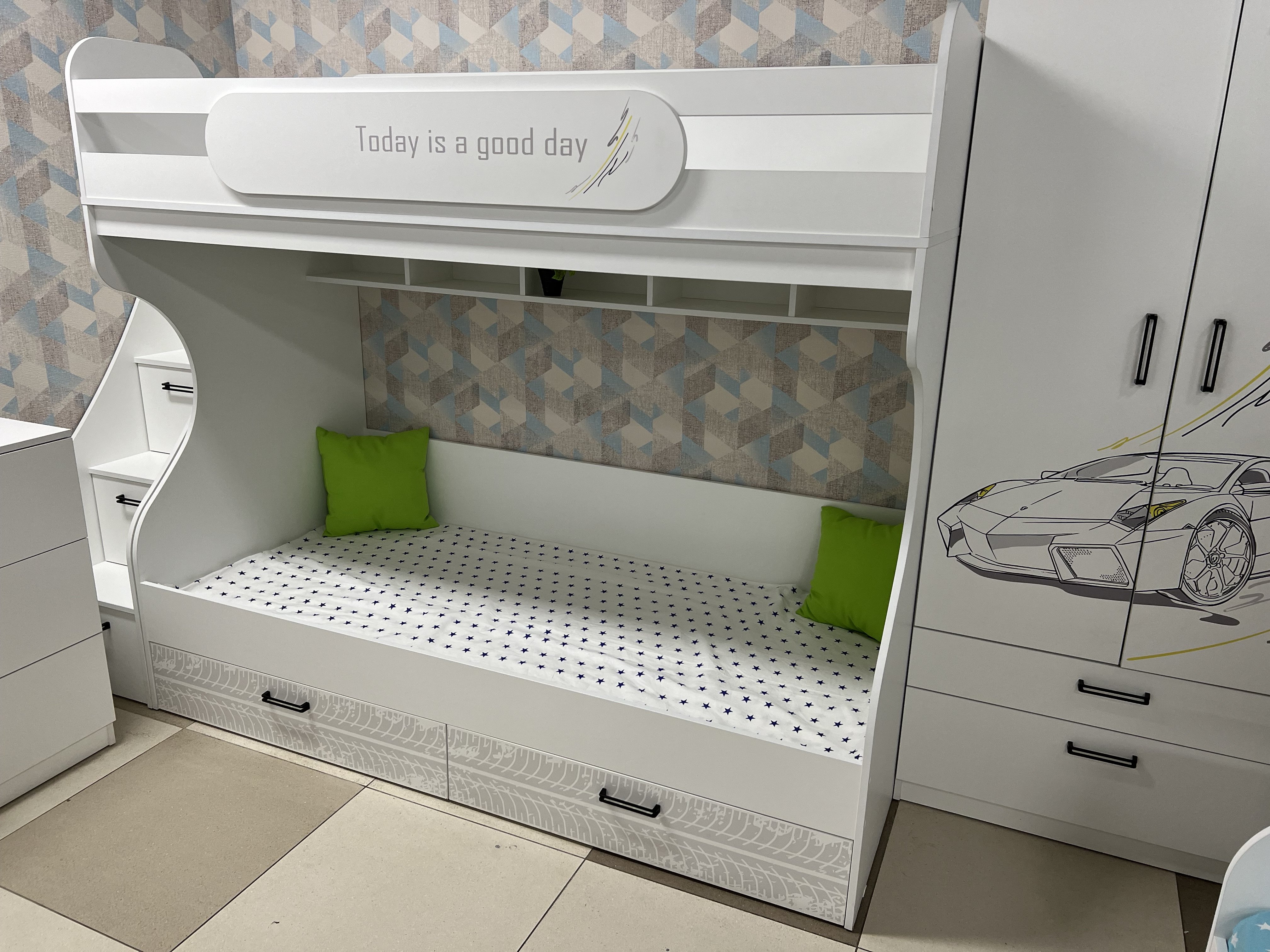 Габариты кровати: ширина с учетом лестницы 2343, глубина 958, высота 1726 мм