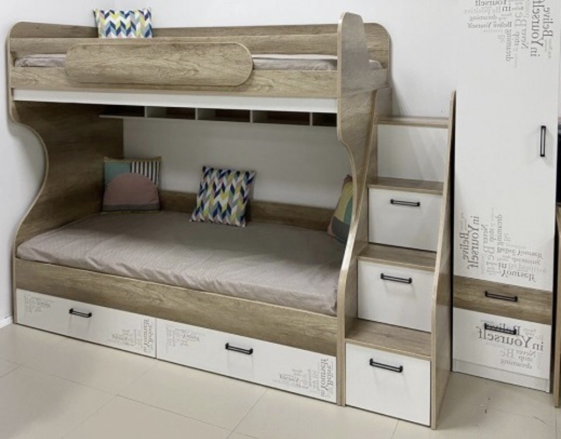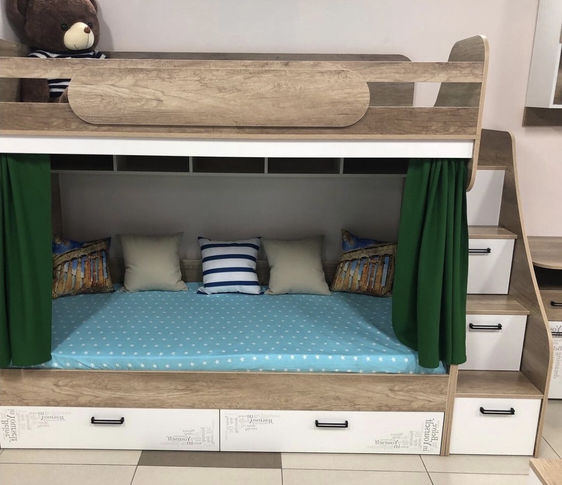 Кровать уникальна наличием лестницы-комода, в которой можно хранить как постельное белье, так и детские игрушки.
