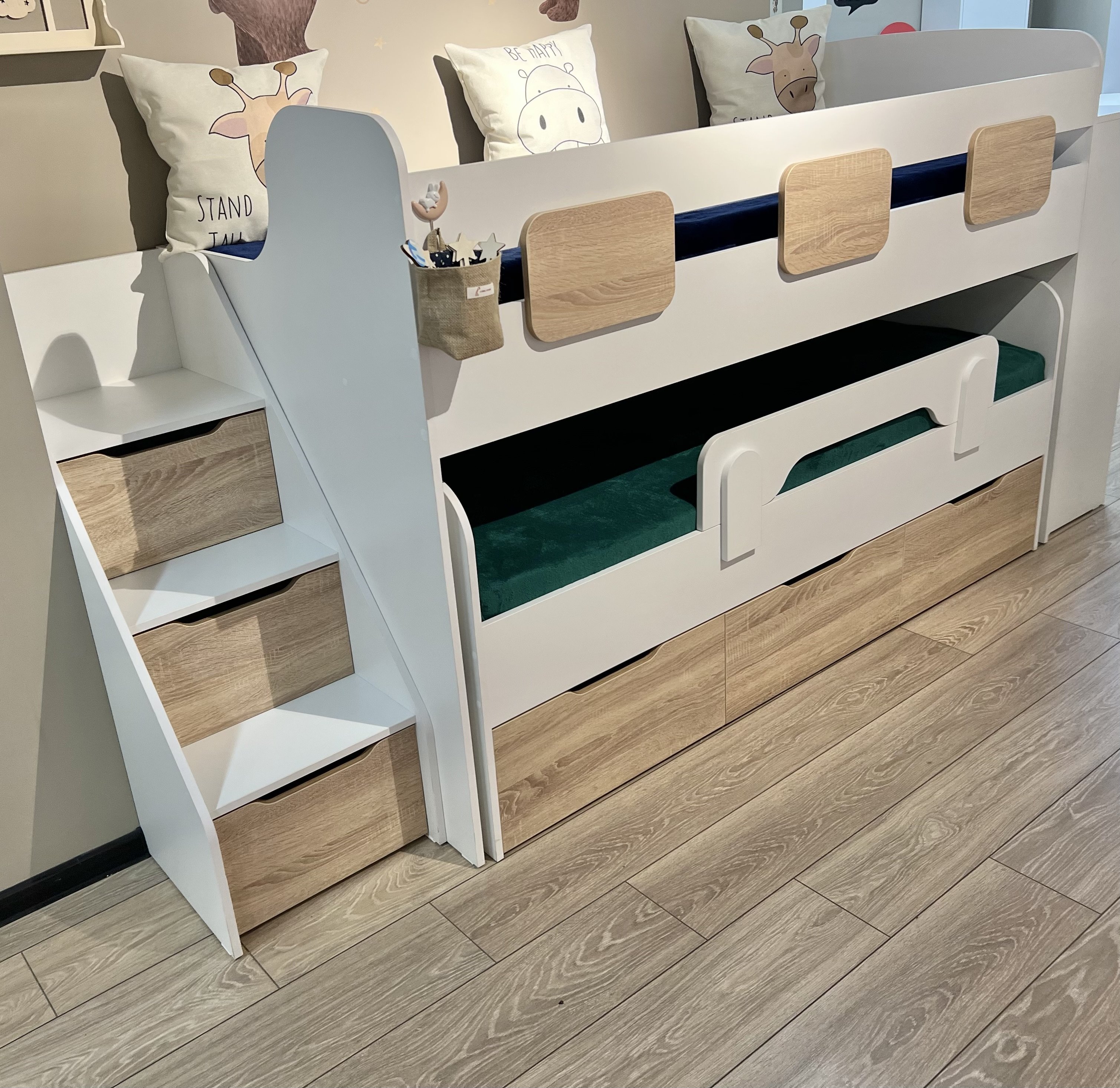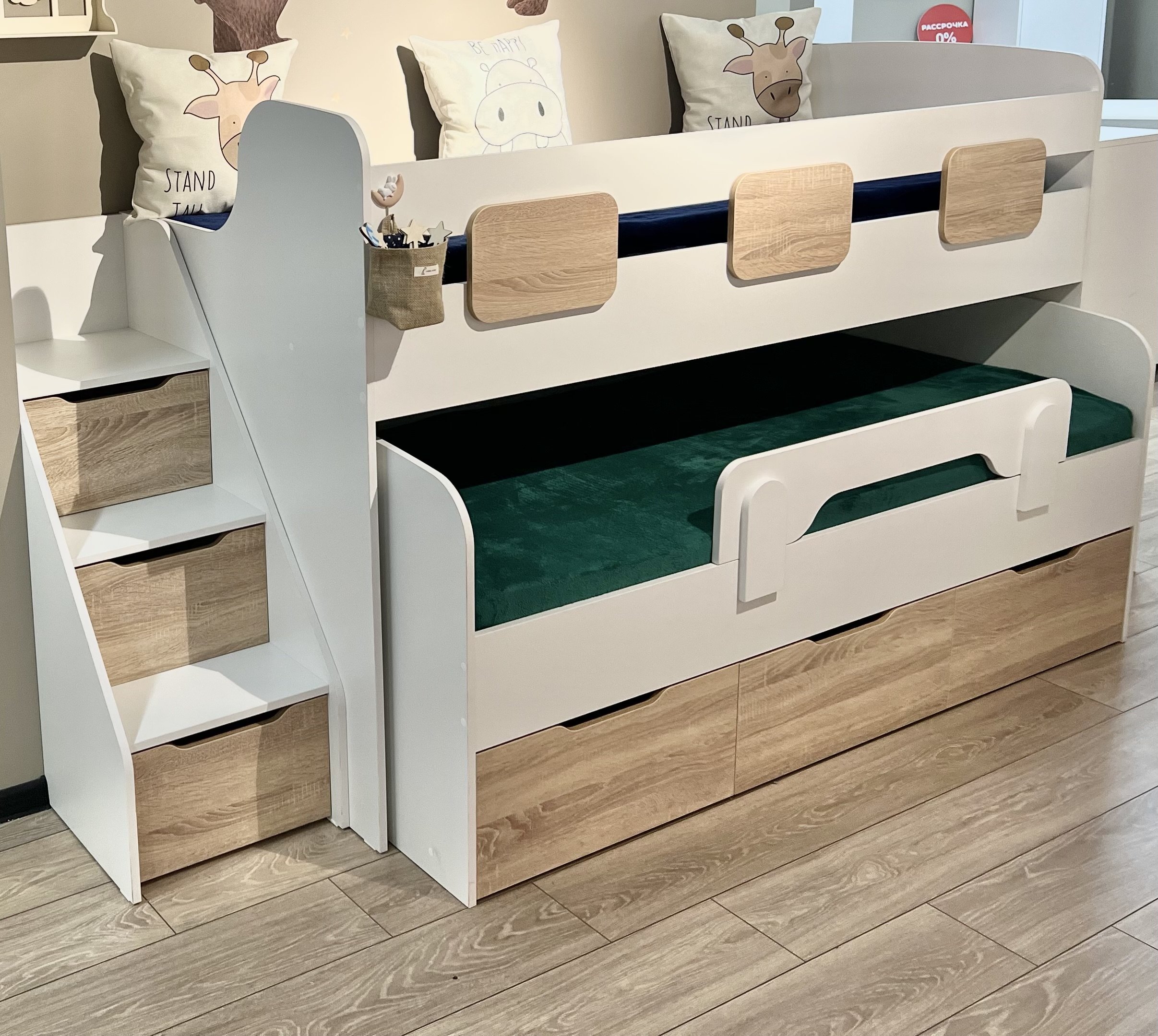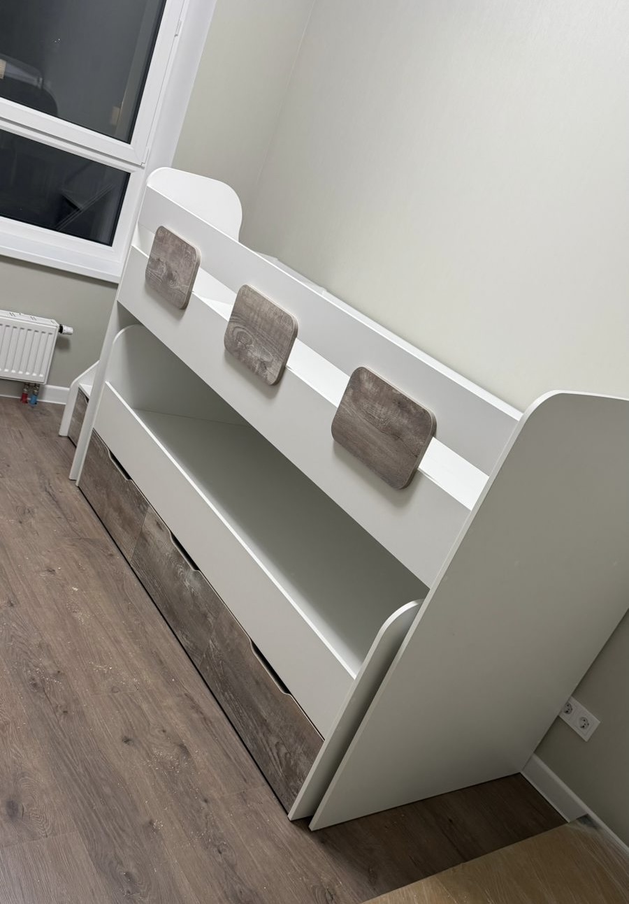 - Невысокая конструкция кровати обеспечивает удобный доступ на второй этаж, делая её идеальной даже для самых маленьких детей.