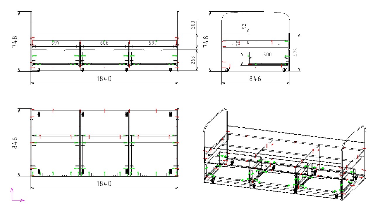 Кровать имеет три выдвижных ящика для хранения белья и игрушек (ящики на шариковых направляющих скрытого монтажа).