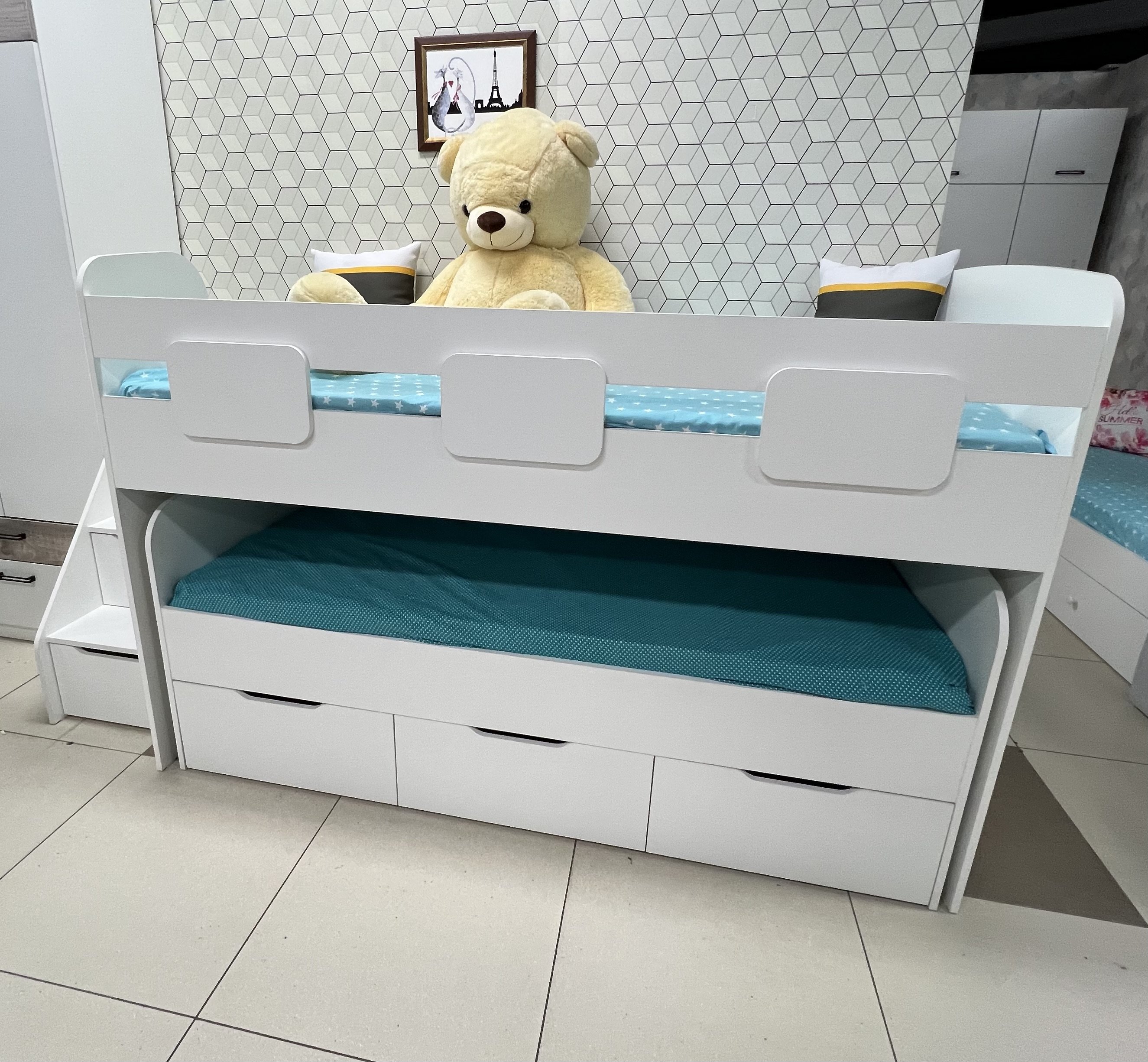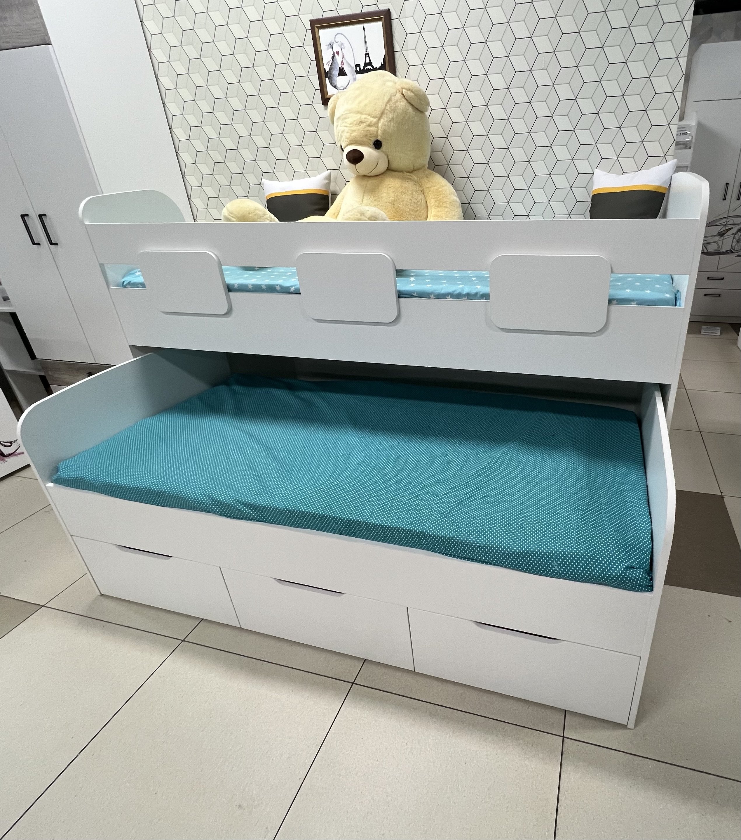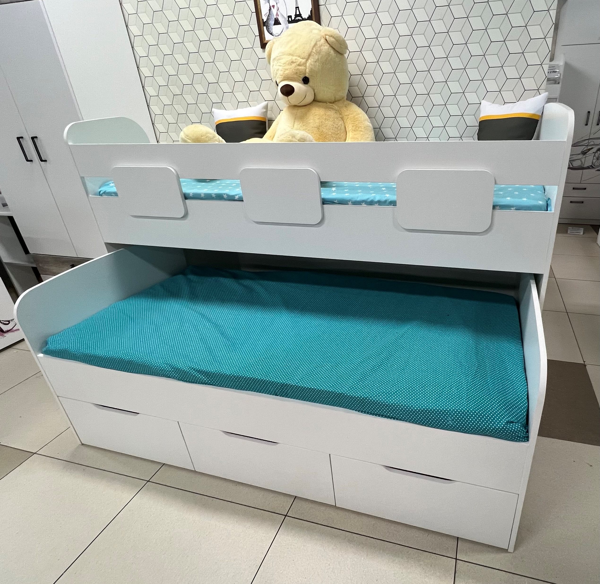 Кровать имеет три выдвижных ящика для хранения белья и игрушек (ящики на шариковых направляющих скрытого монтажа).