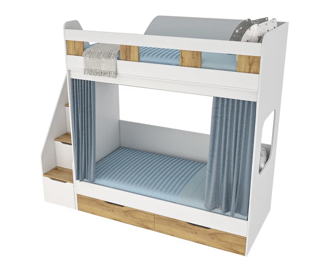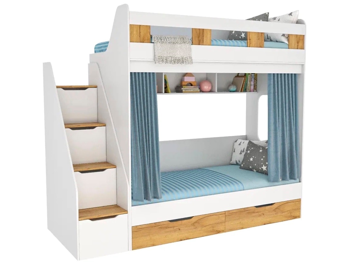 спальное место для двоих, навесная полка для книг и игрушек, вместительные выдвижные ящики под кроватью, а также безопасная лестница расположенная сбоку, обеспечивающая быстрый и удобный доступ на второй этаж, с безопасными ступенями в виде выдвижных ящиков.