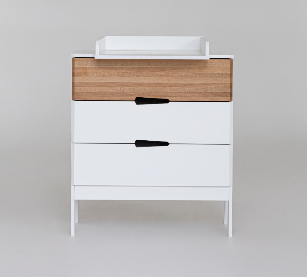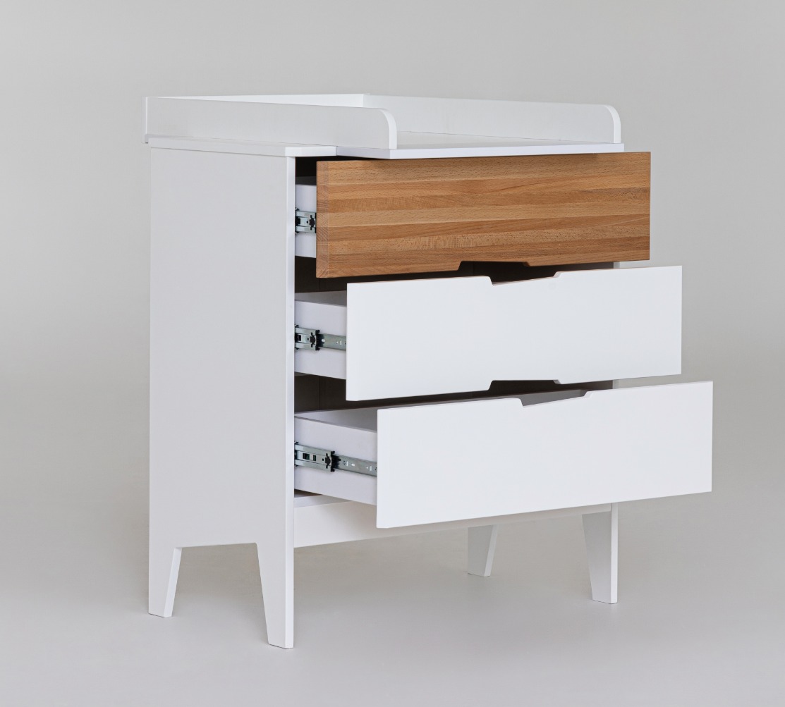 Все элементы изделия скруглены, а каркас и фасады изготовлены из экологически чистого материала, покрытые износостойкой безопасной краской. Комод оснащен съемным пеленальным столиком.
