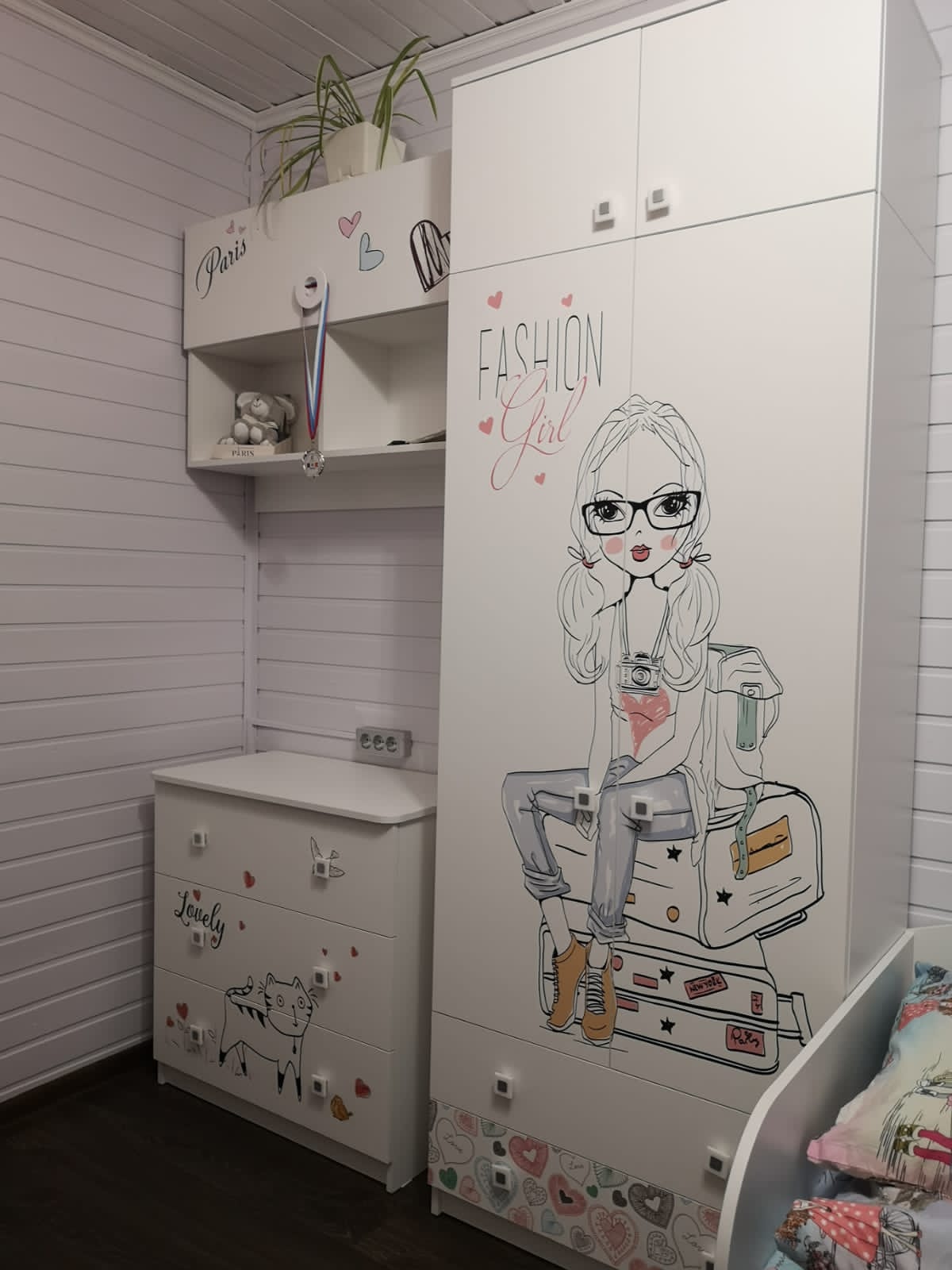 Мебель выполнена из сертифицированного, качественного, экологически чистого российского ЛДСП в популярном белом цвете с дизайнерским принтом.