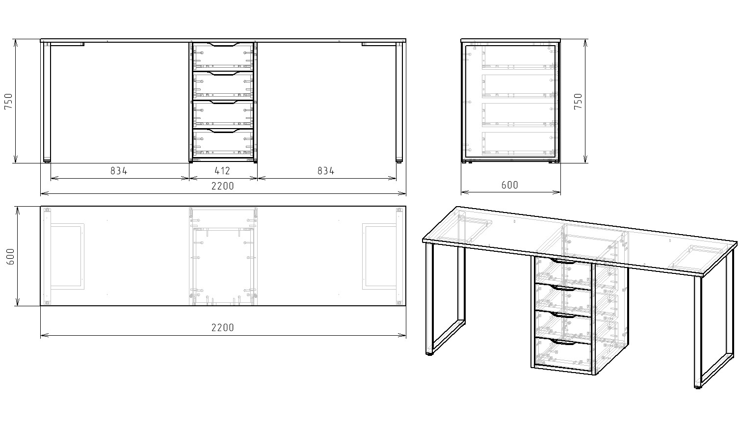 Габариты стола: ширина 2200 х высота 750 х глубина 600 мм