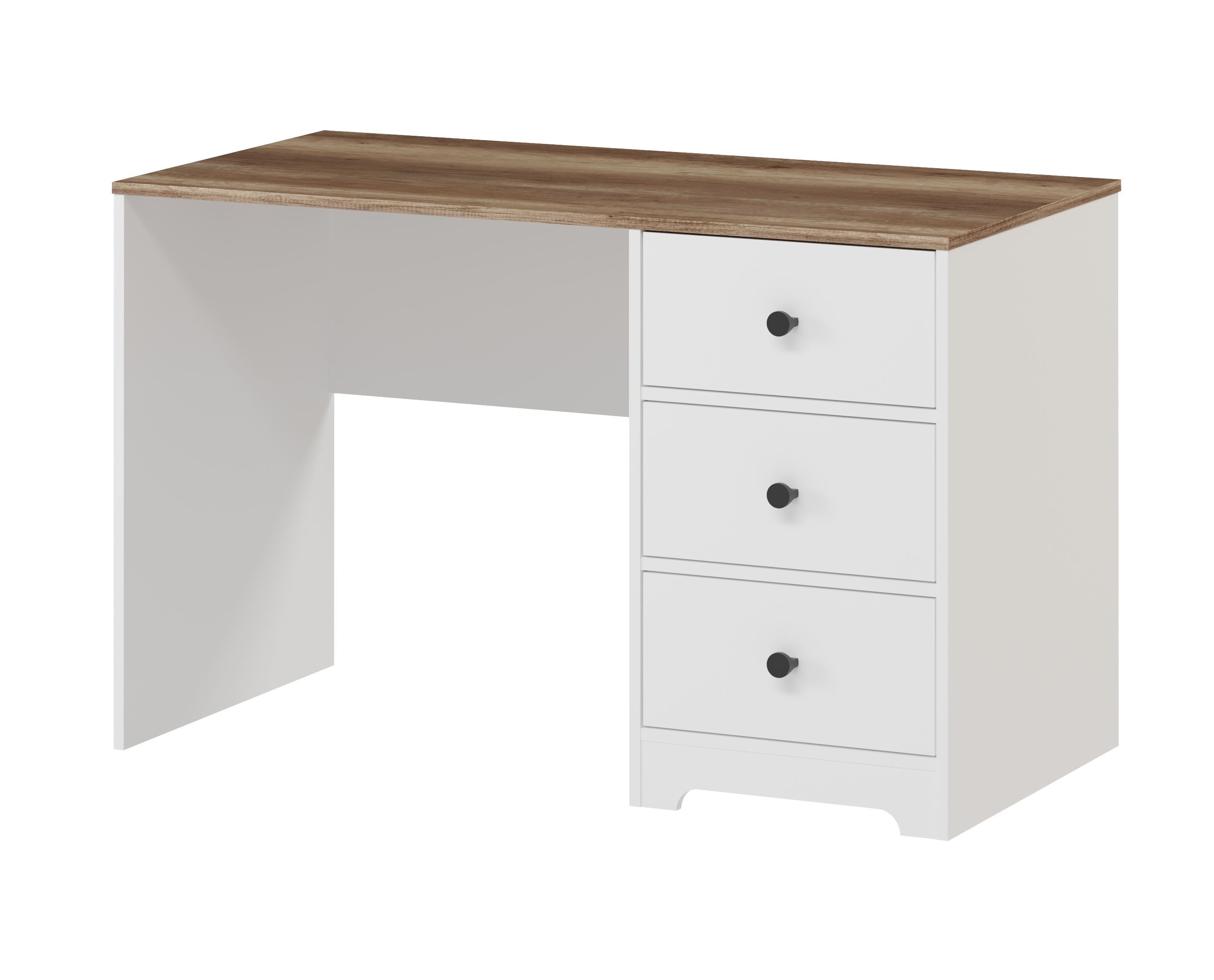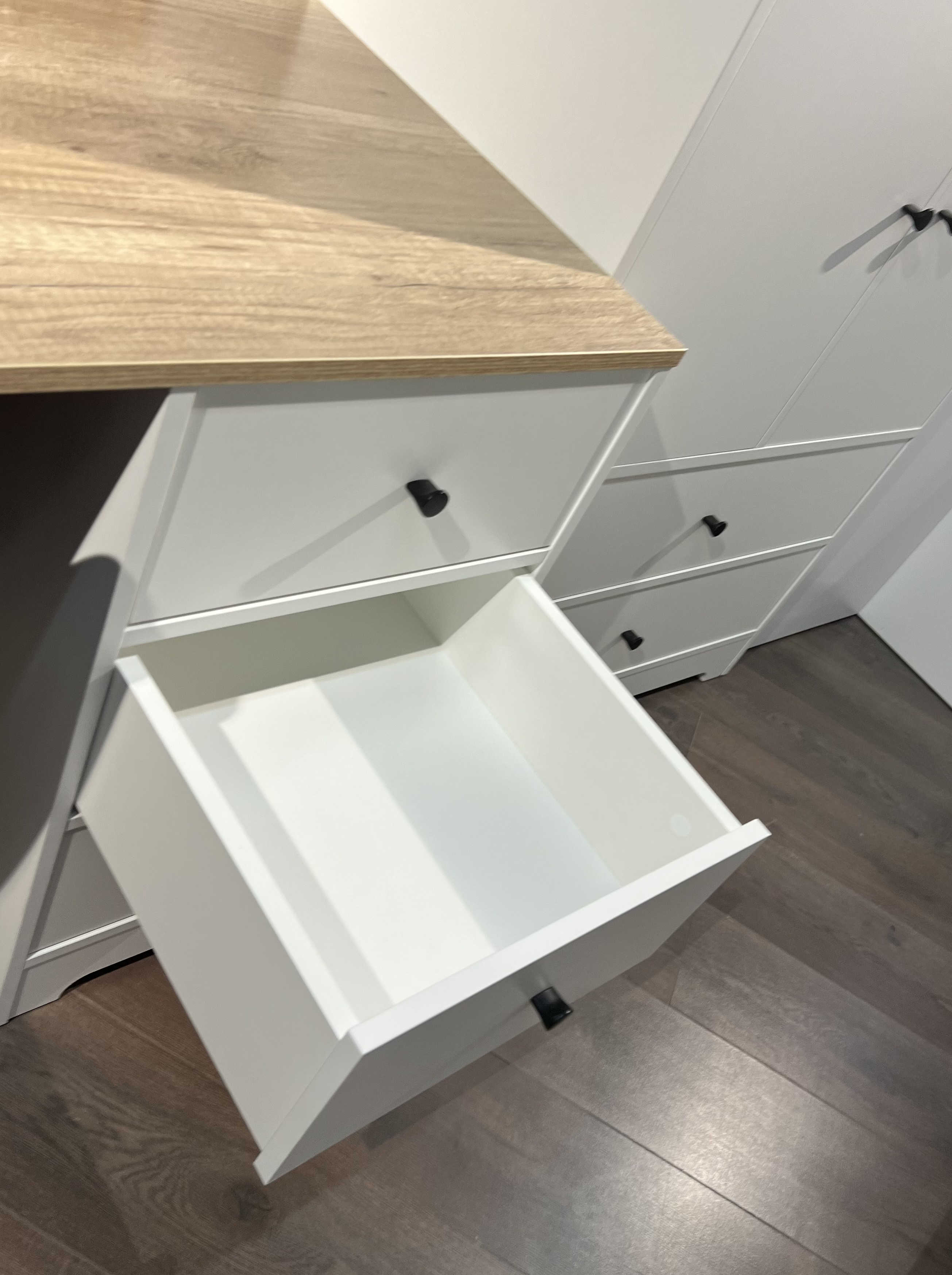 В стол встроены три выдвижных ящика на направляющих скрытого монтажа с ДОВОДЧИКАМИ.