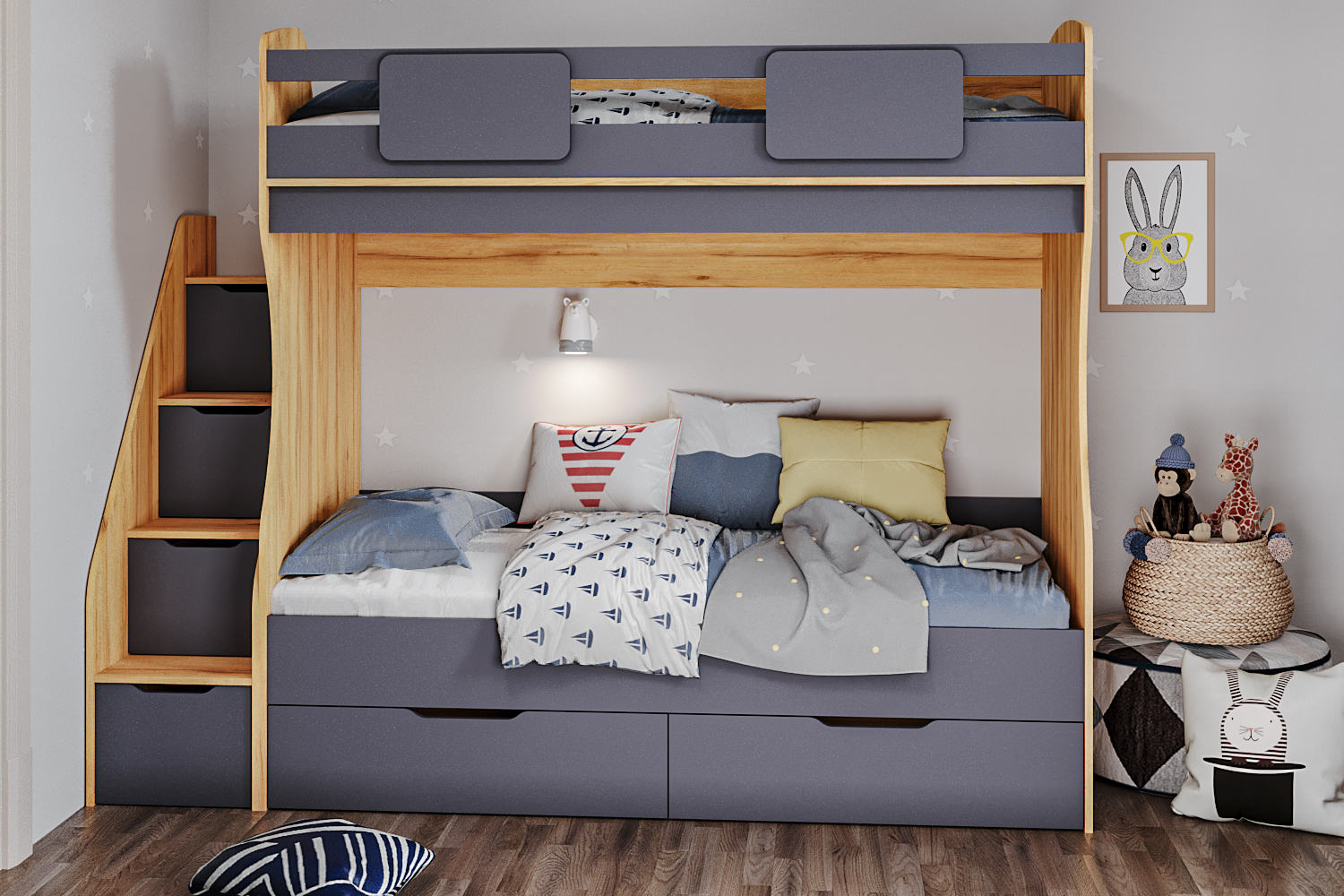 Кровать имеет также два выдвижных ящика для хранения белья или игрушек с доводчиками.
