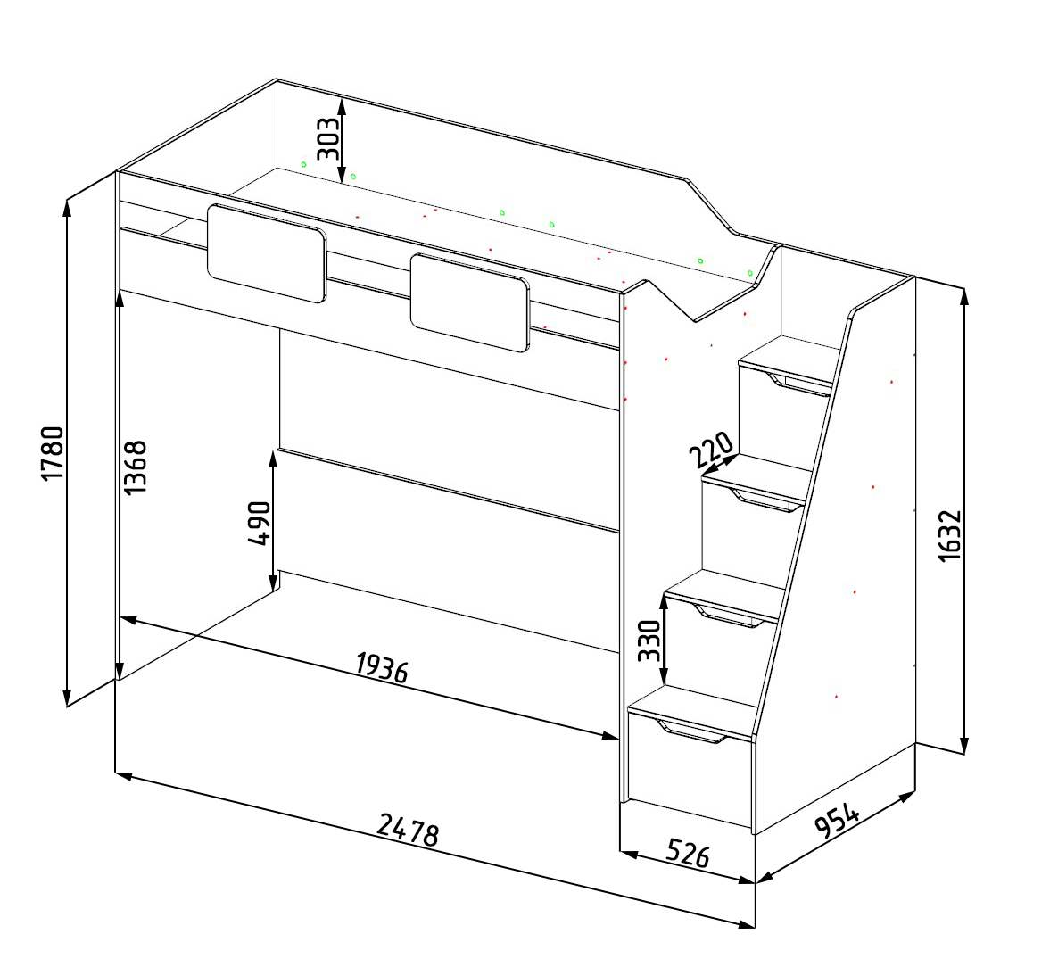 Габариты кровати-чердака: ширина с учетом лестницы 2478, глубина 968, высота 1780 мм