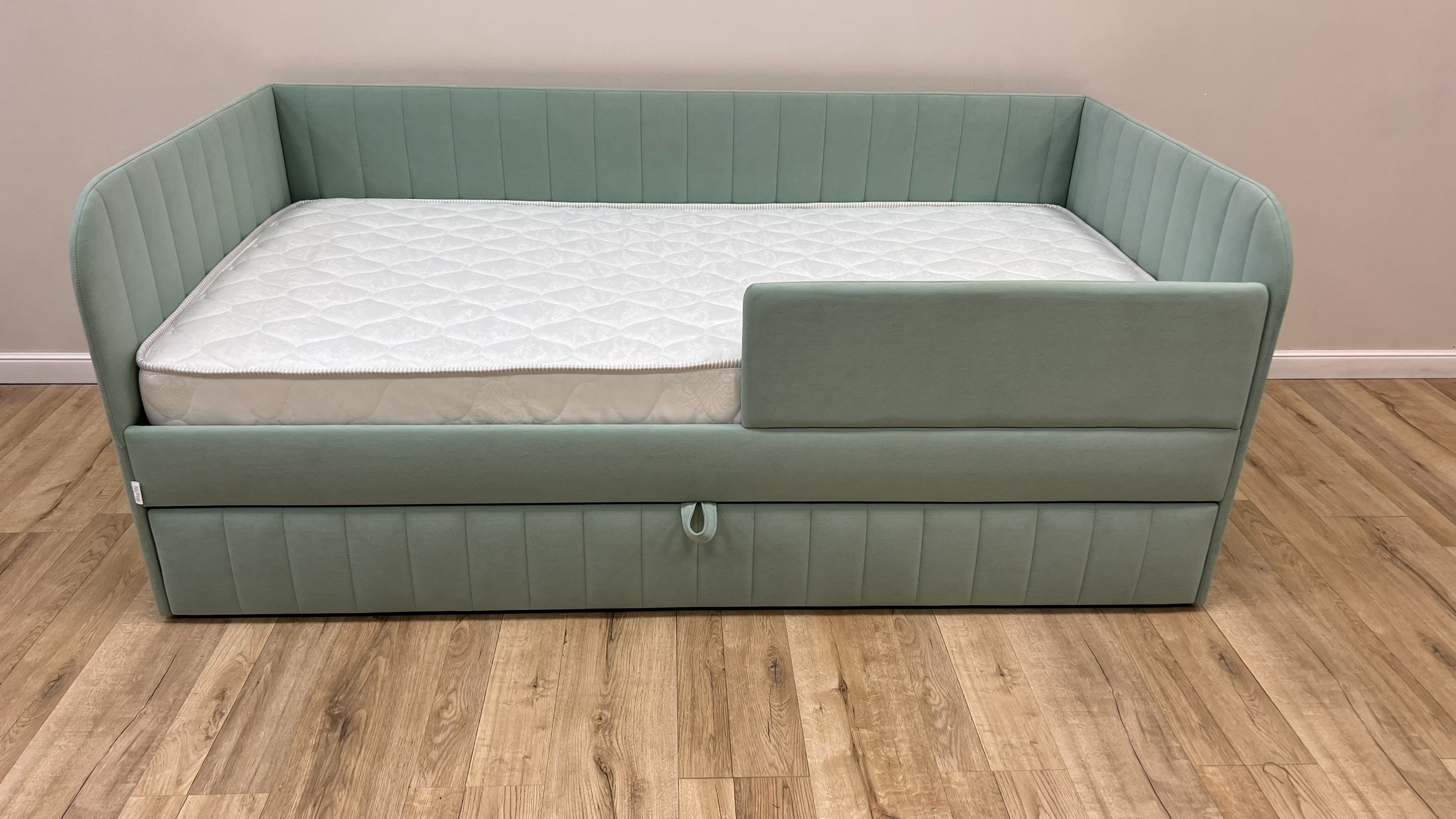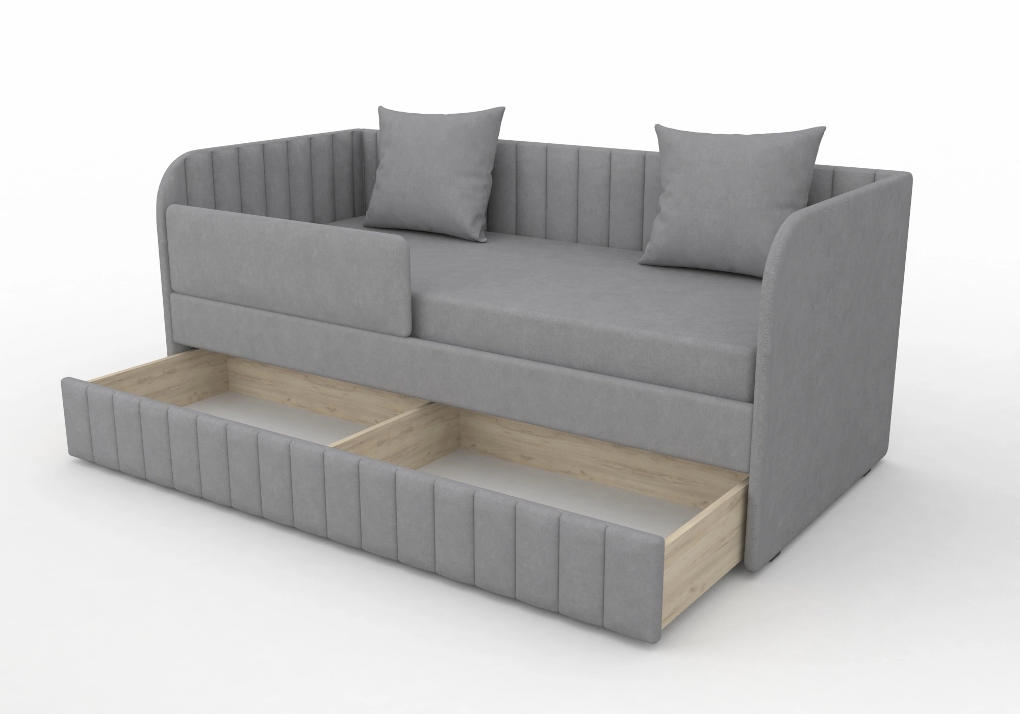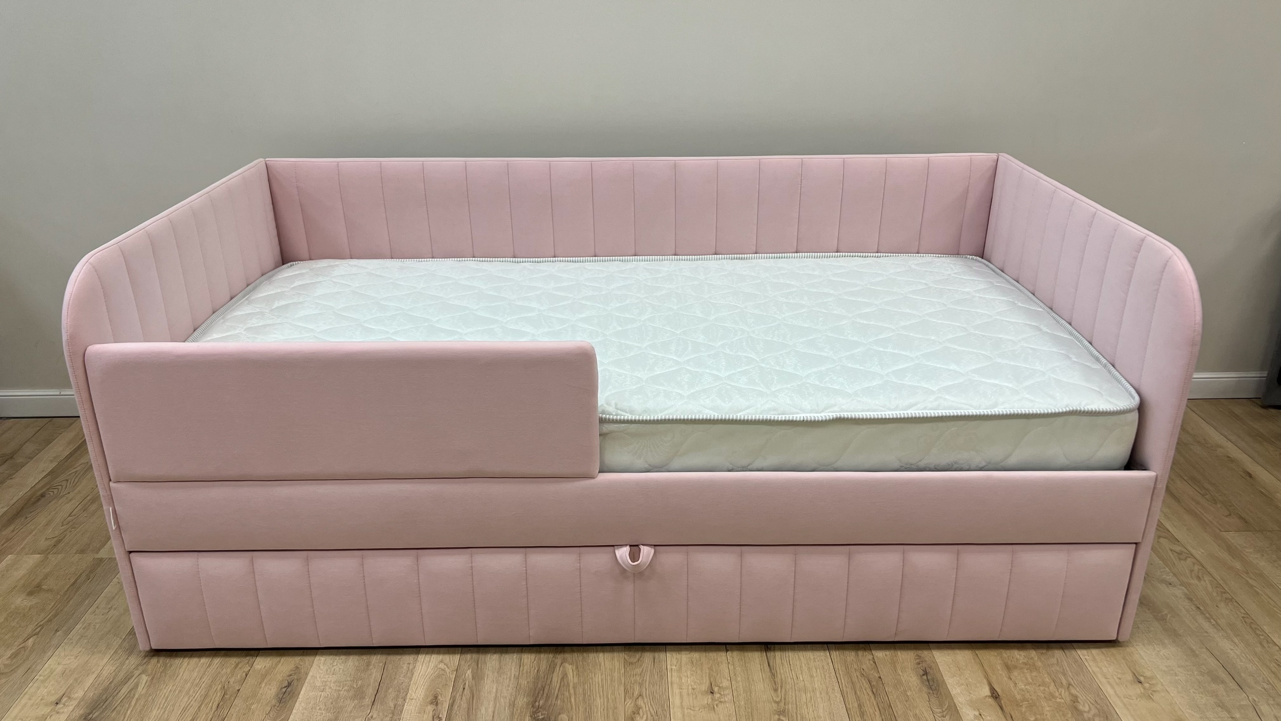 Кровать полностью безопасна для ребенка, так как имеет прочную конструкцию и мягкие подлокотники, которые защитят ребенка от травм.
