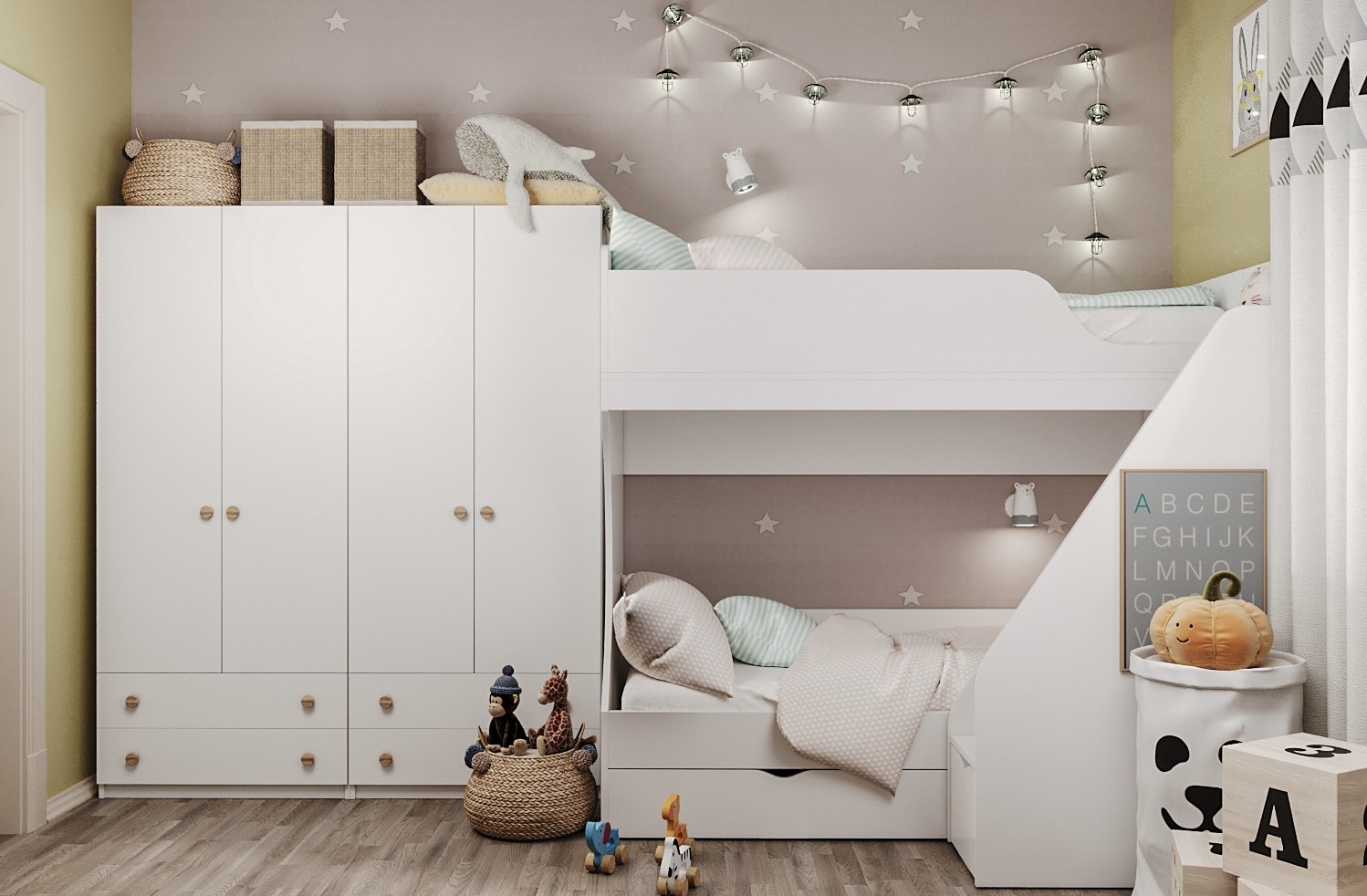 В нижнюю кровать встроен выдвижной ящик для белья и игрушек.
