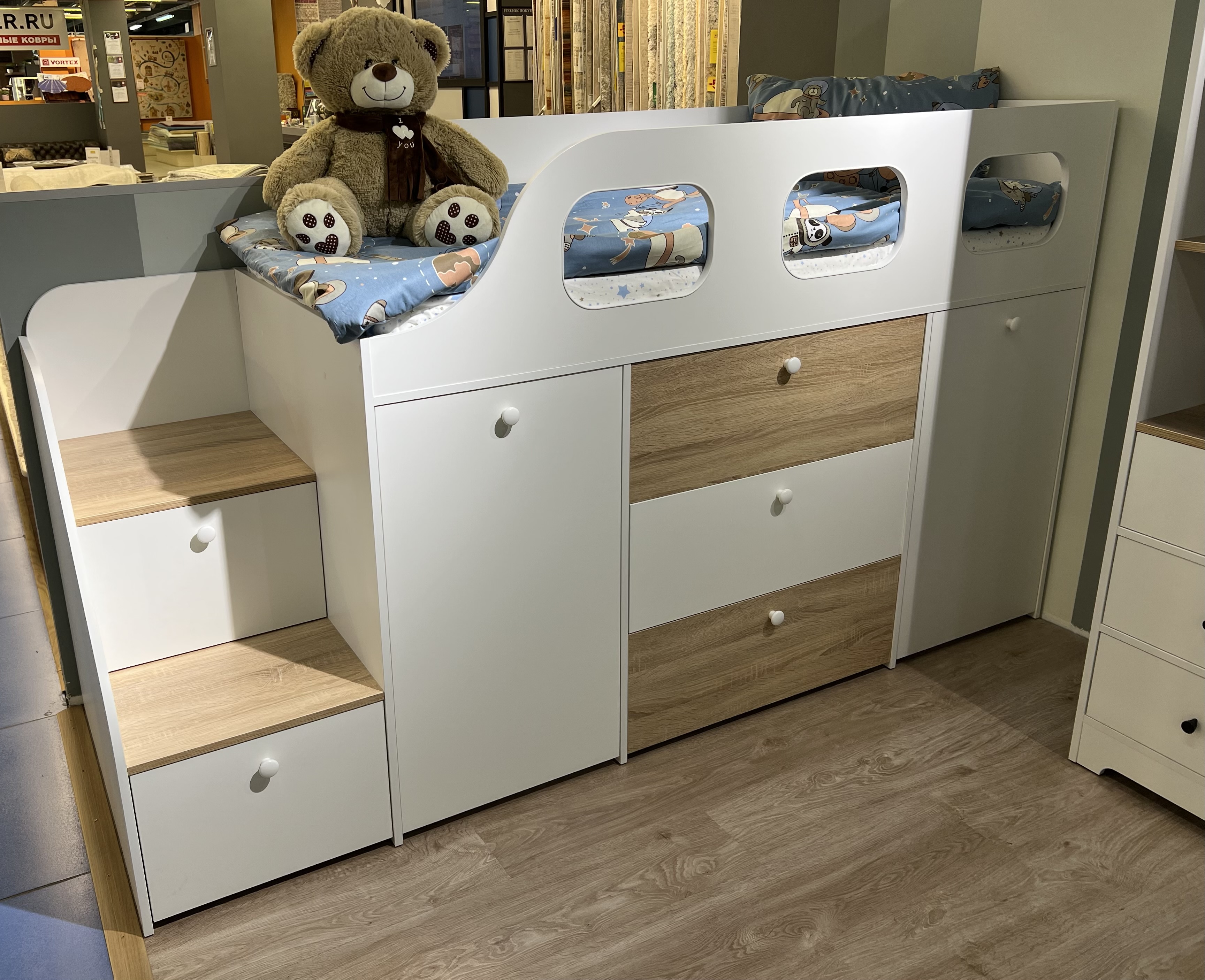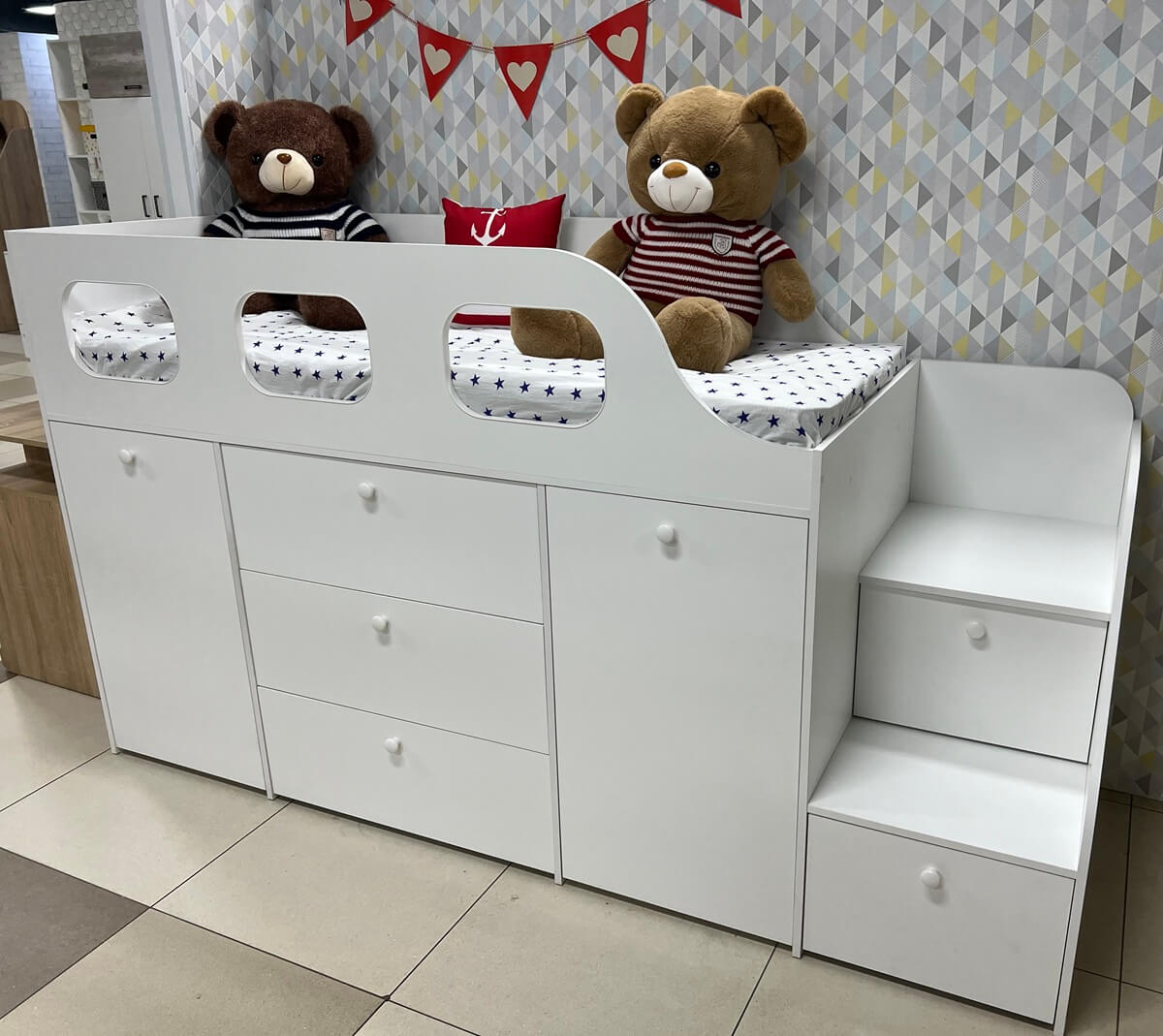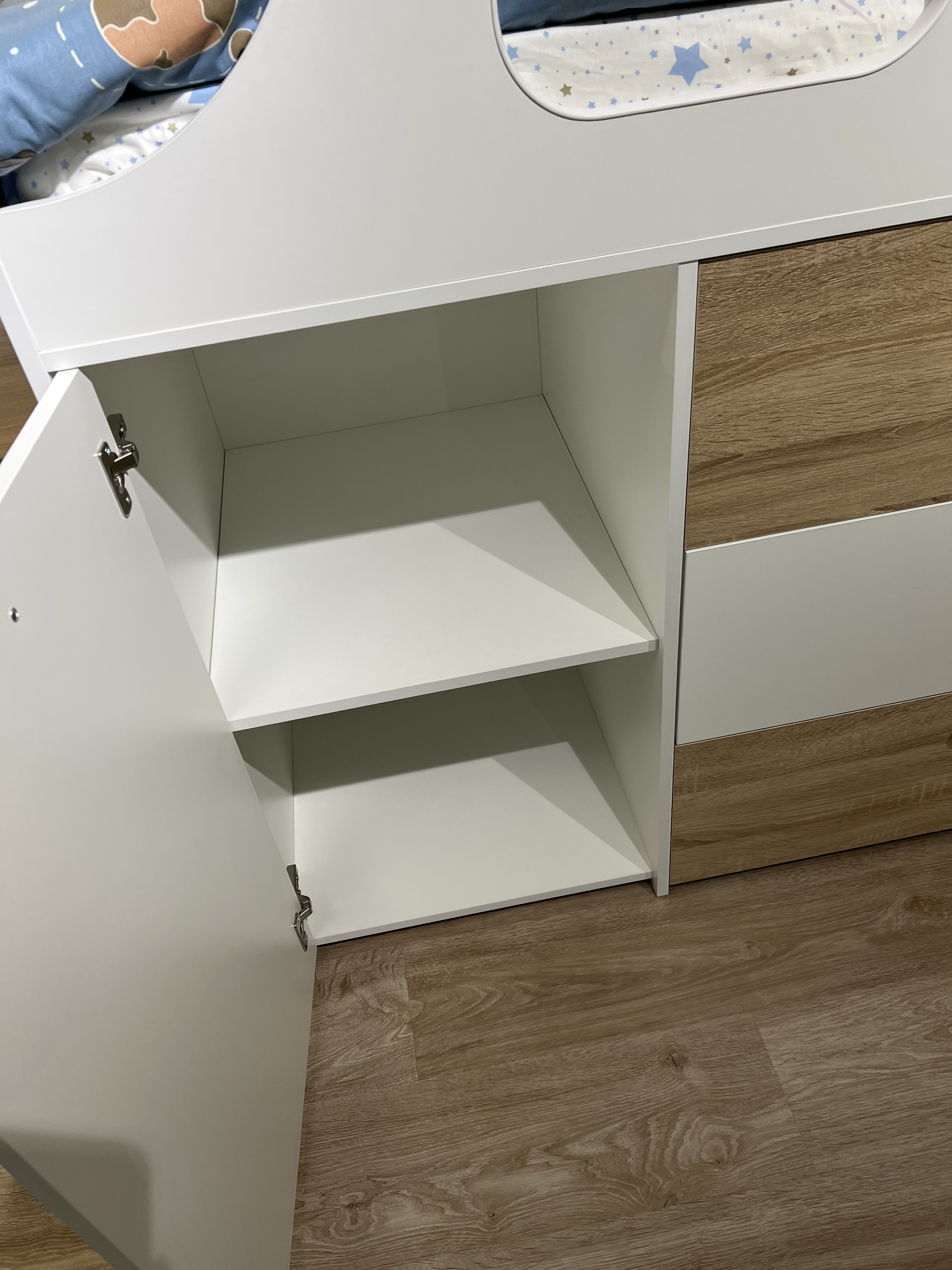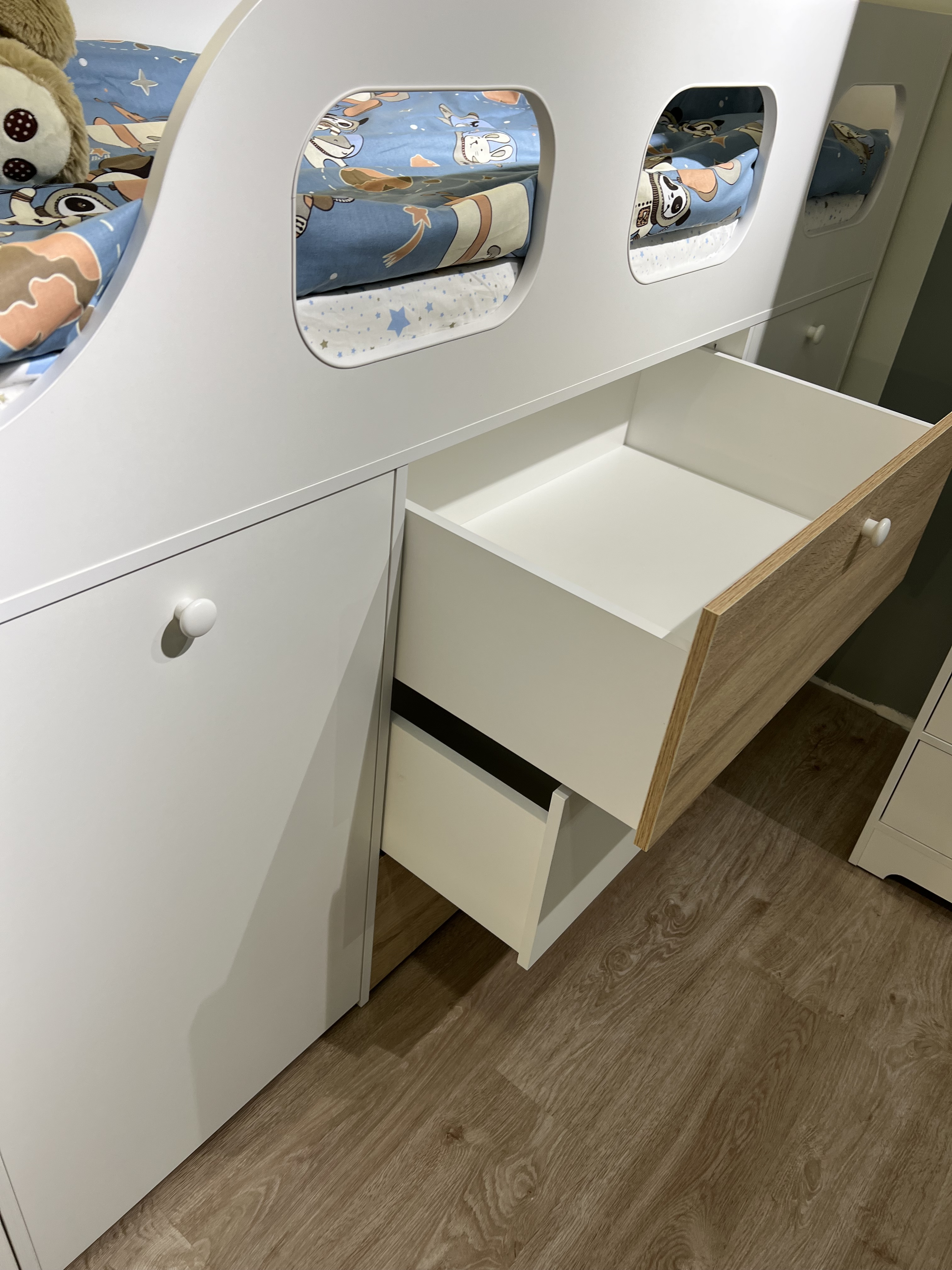 Доводчики, высокий безопасный бортик. Прочное основание из ЛДСП 16 мм. Не скрипит и не сломается при играх. Дно ящиков выполнено из ЛДСП 16 мм (не ДВП!) |
