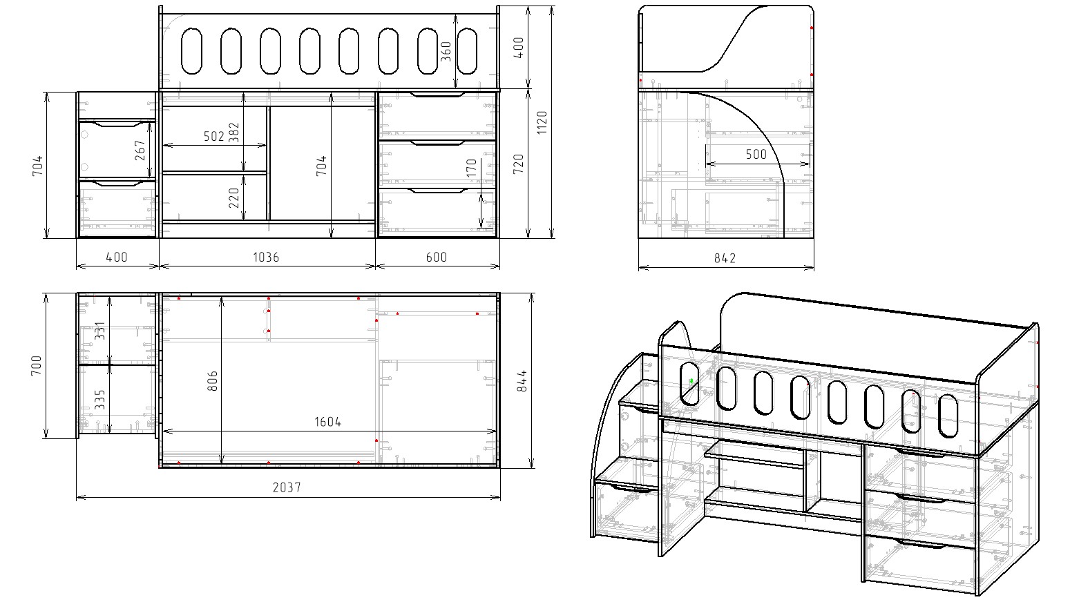 Габариты кровати: ширина 2037, глубина 842, высота 1120 мм