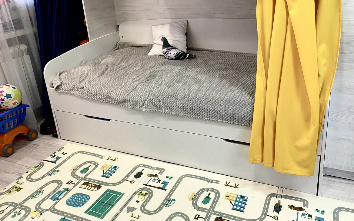 Нижняя кровать на выкатных роликах (при желании кровать можно выдвинуть полностью и поставить в другое место).