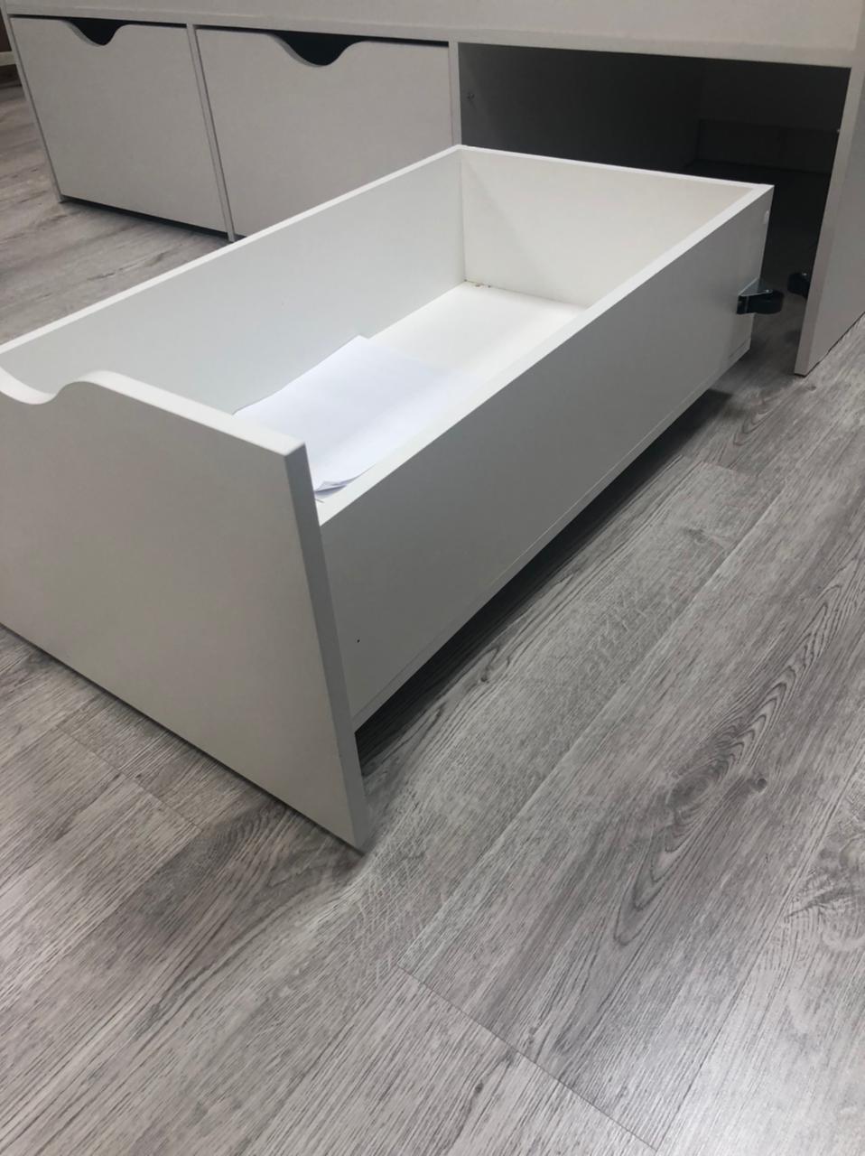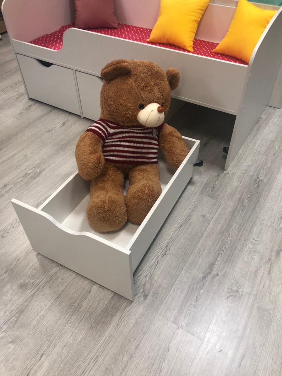 Прочное основание из ЛДСП 16 мм. Не скрипит и не сломается при играх. Дно ящиков выполнено из ЛДСП 16 мм (не ДВП!)