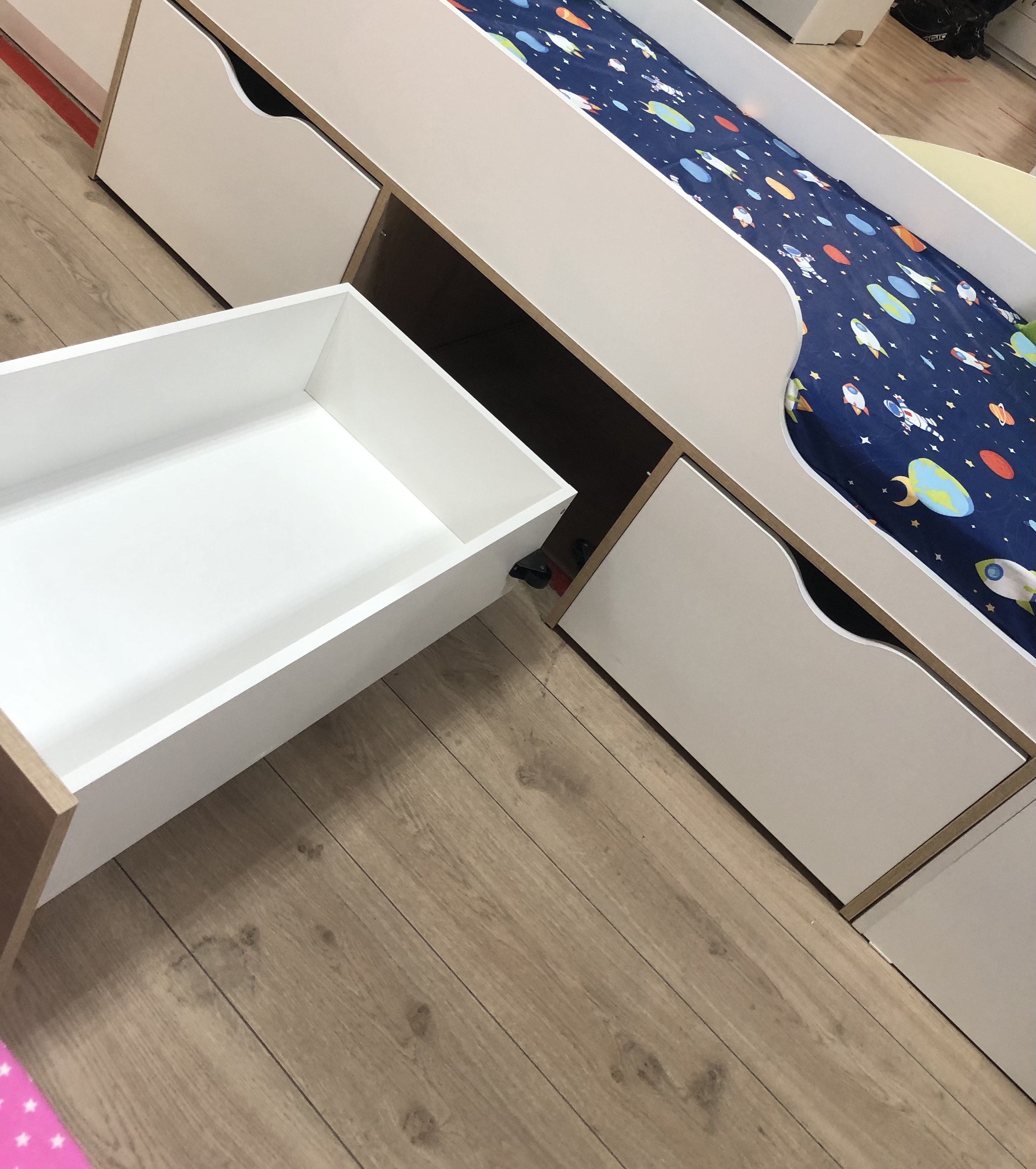 Три вместительных выдвижных ящика помогут всегда хранить личные вещи и игрушки ребенка в собранном виде.