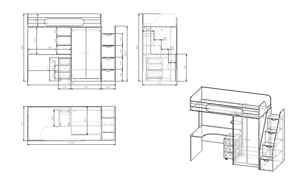 Габариты: глубина 952 х высота 1866 х ширина с лестницей 2438 мм