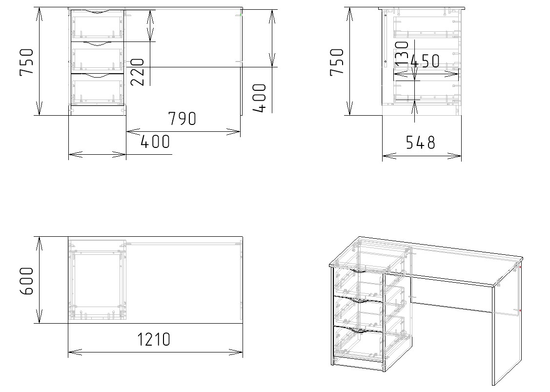 Габариты стола: ширина 1300, высота 750, глубина 600 мм