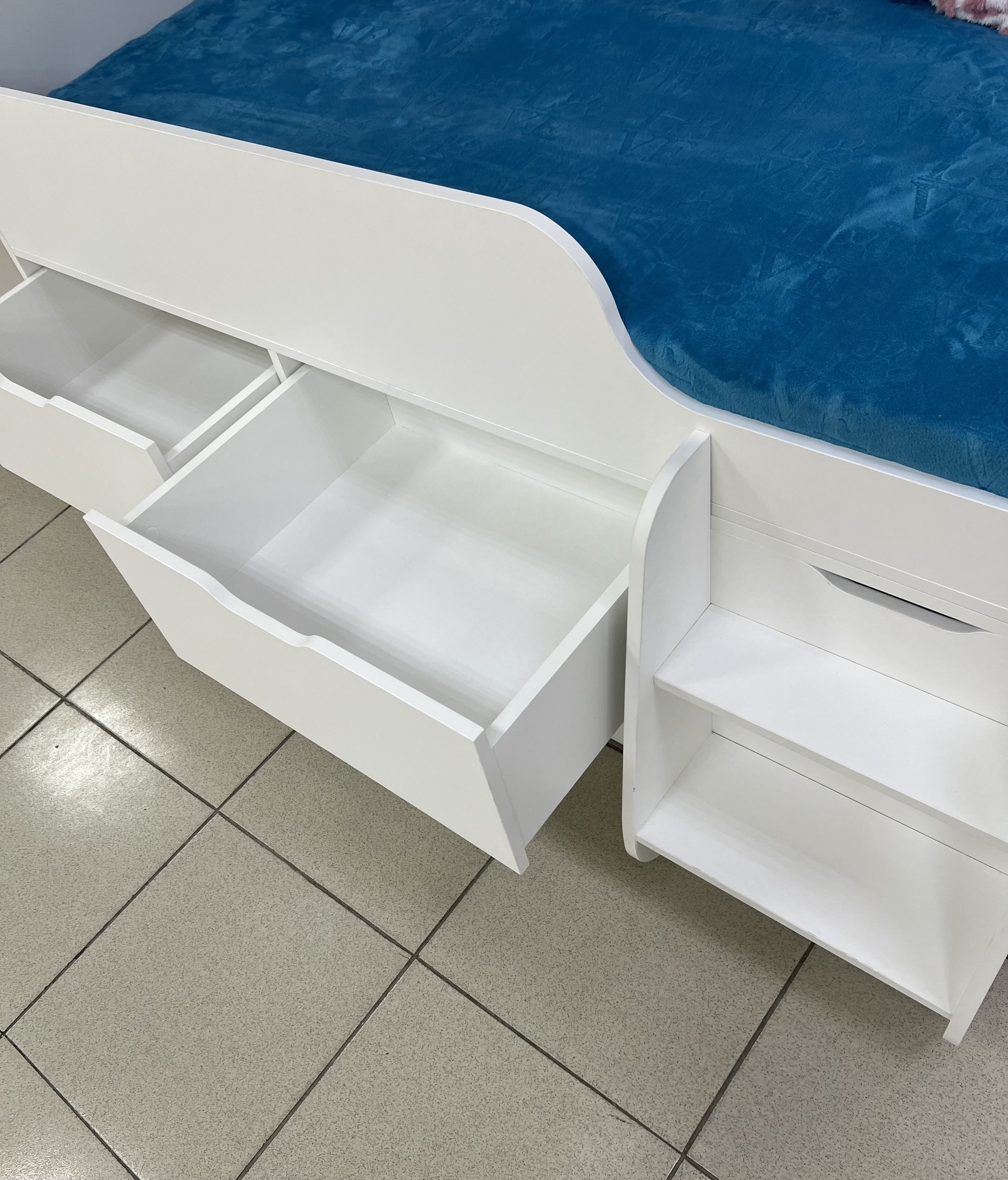 Безопасные бортики, удобная выдвижная лестница с внутренними полочками и небольшая высота кровати сделаны специально для детей младшего возраста.