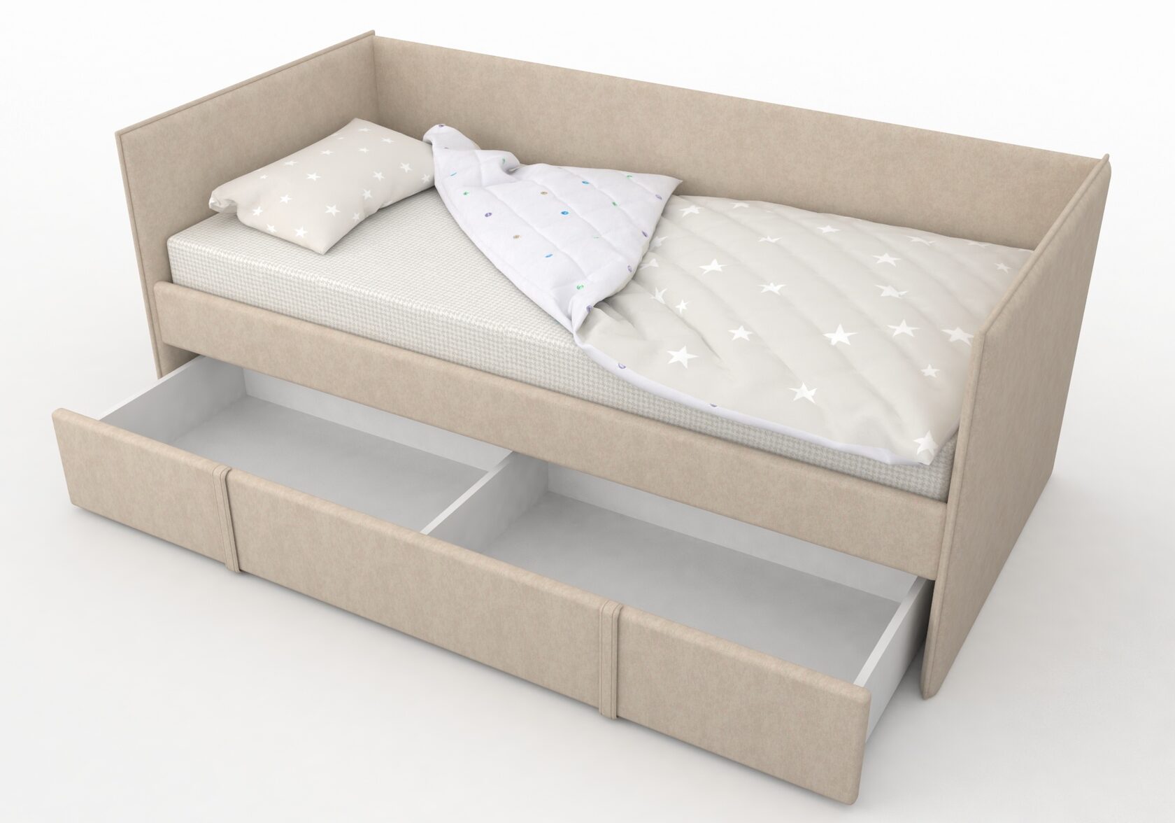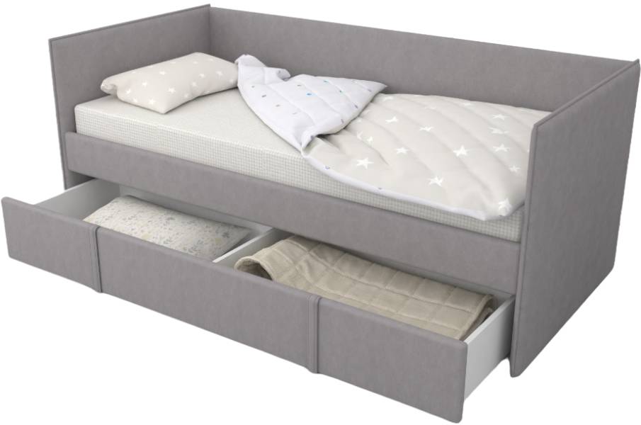 Модель кровати имеет ящик выкатного типа с 2-мя секциями для хранения постельных принадлежностей и одежды ребенка.