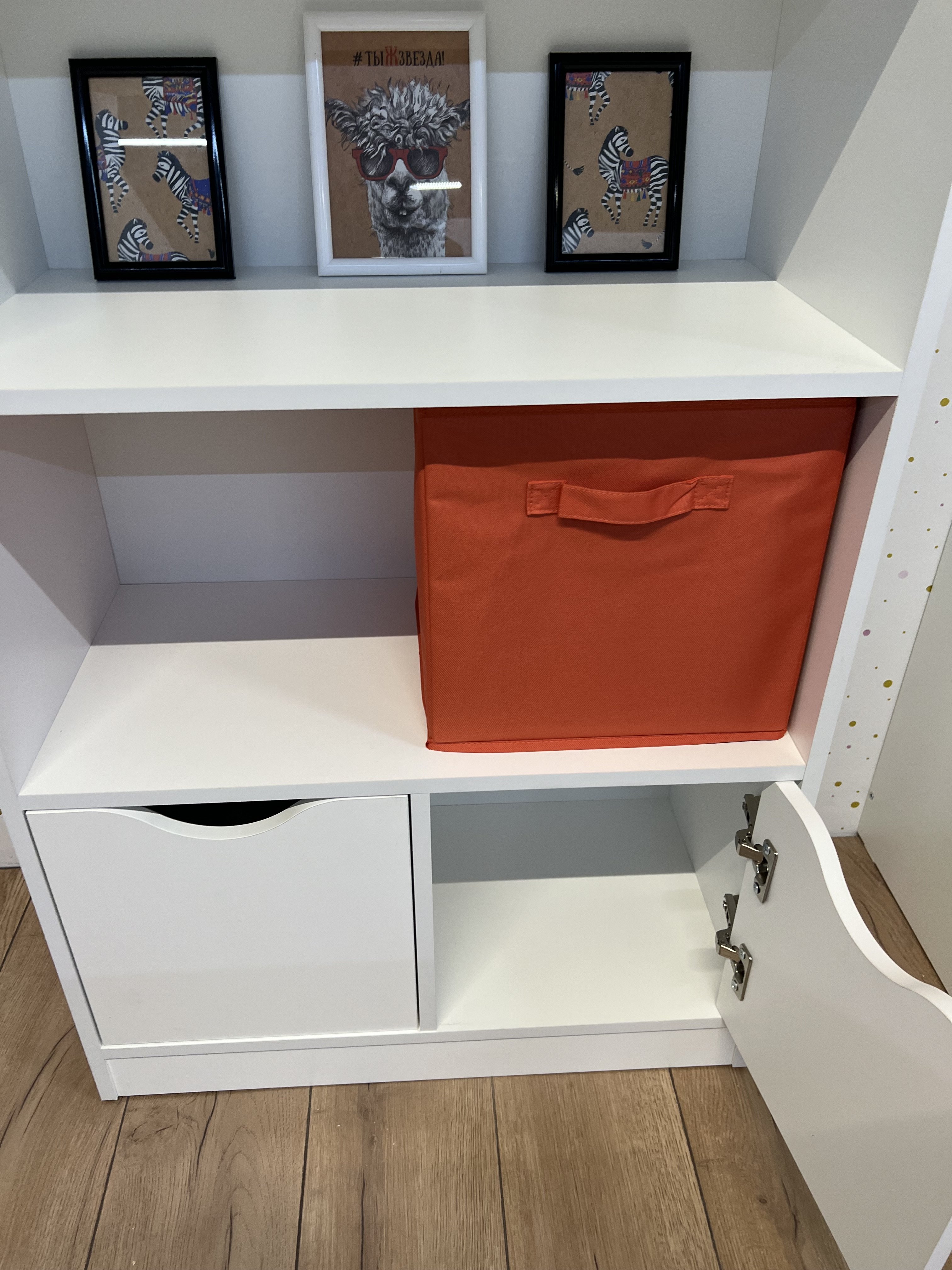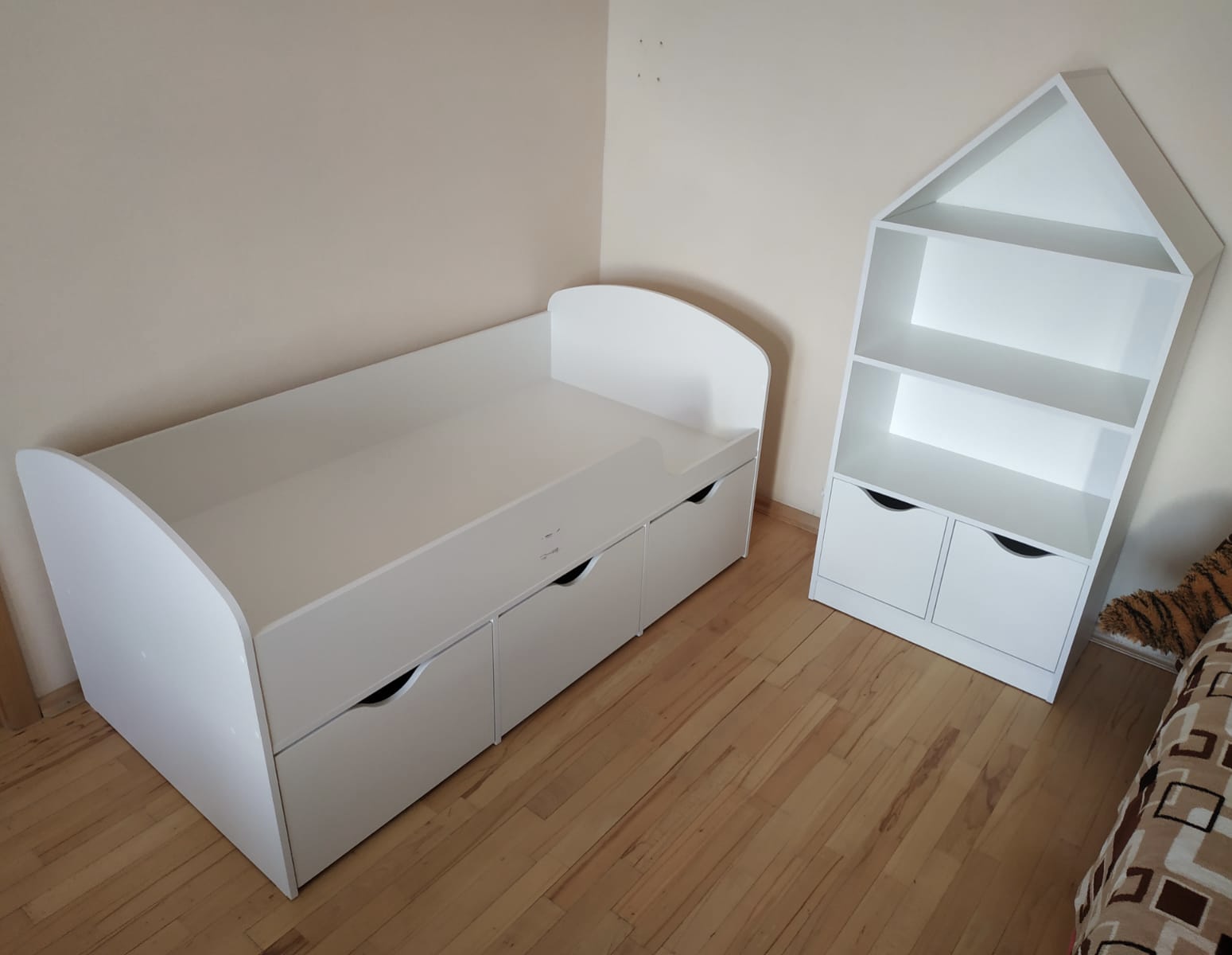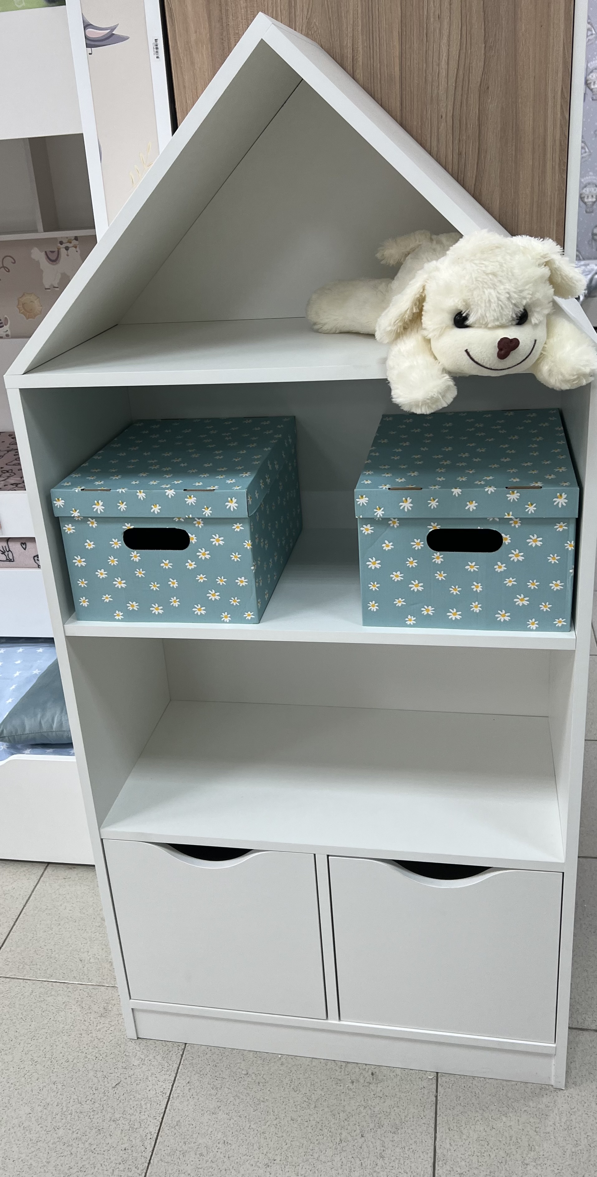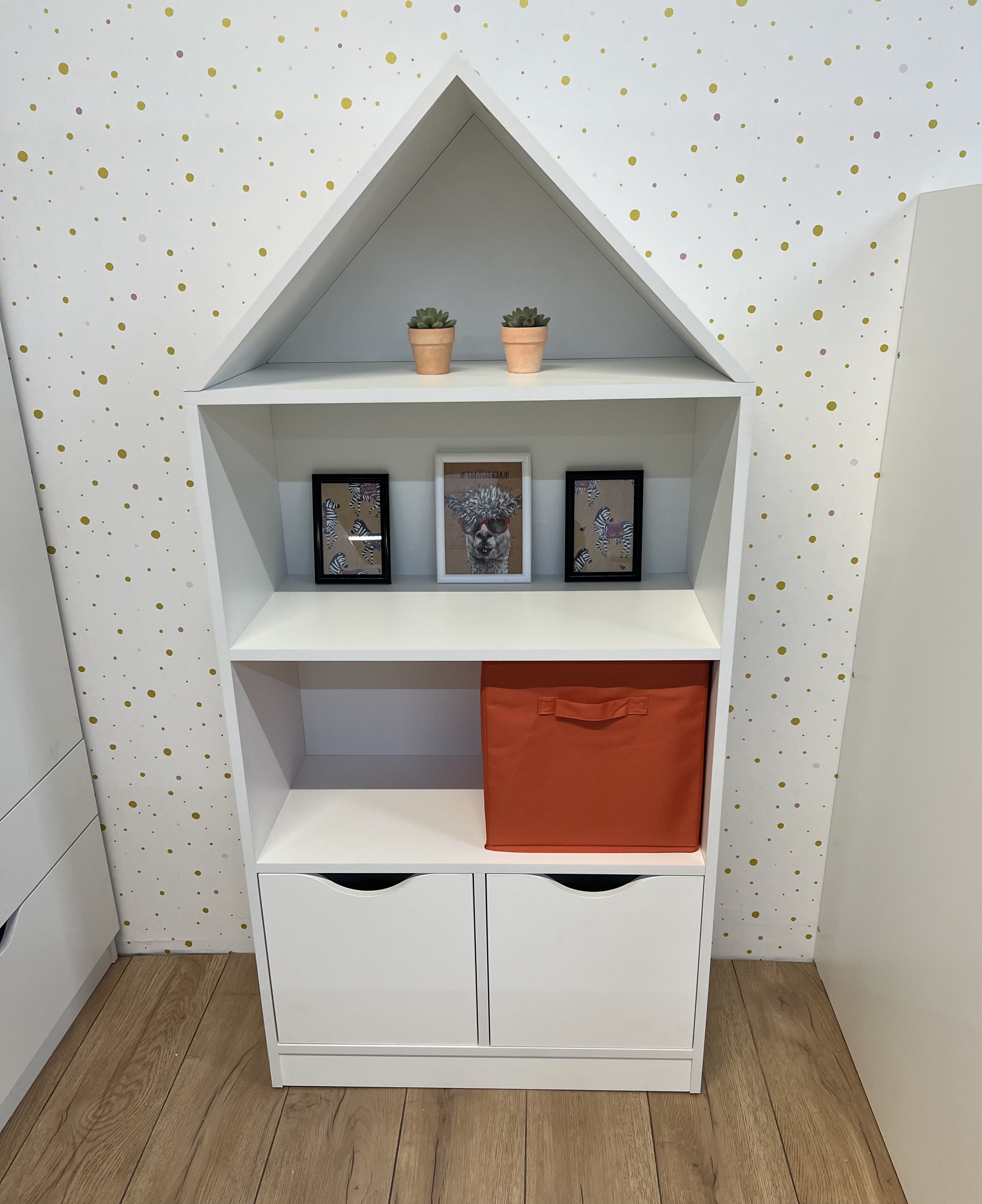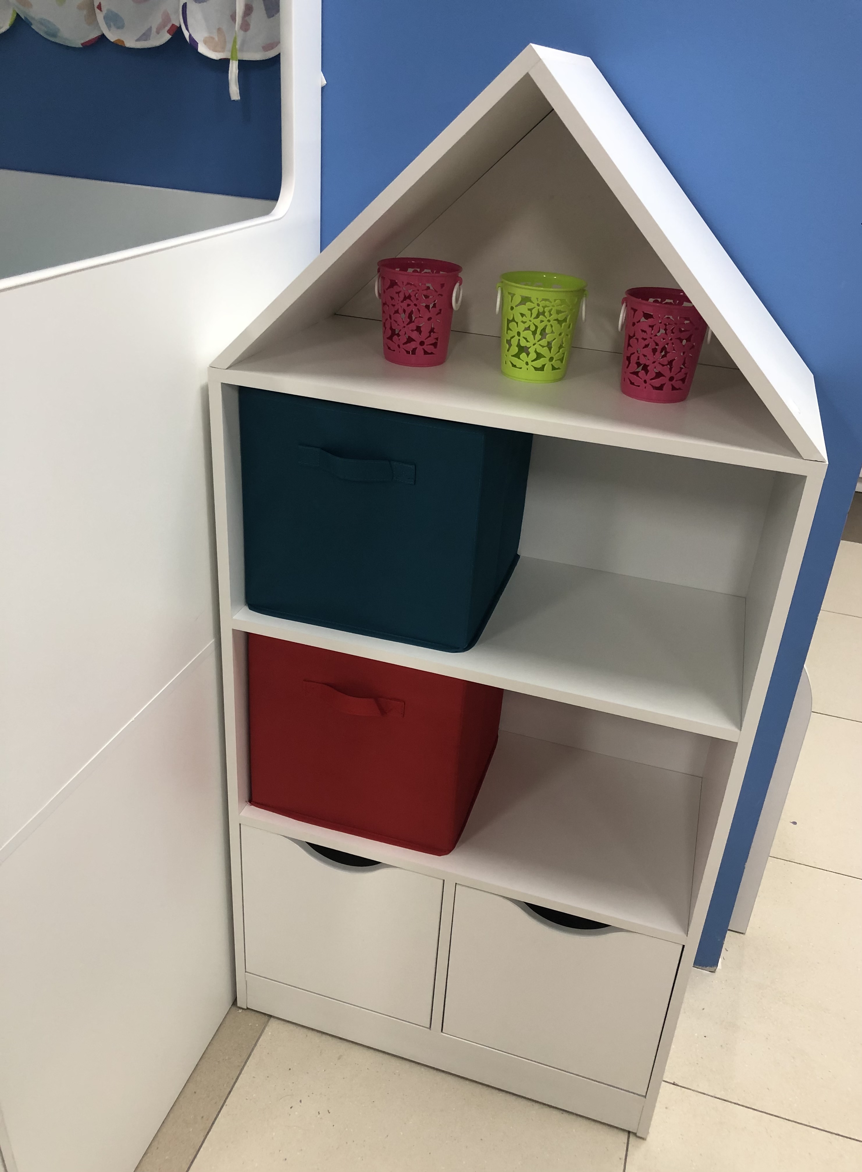 Стеллаж в виде домика - оригинальное и практичное дополнение в интерьере детской комнаты.
