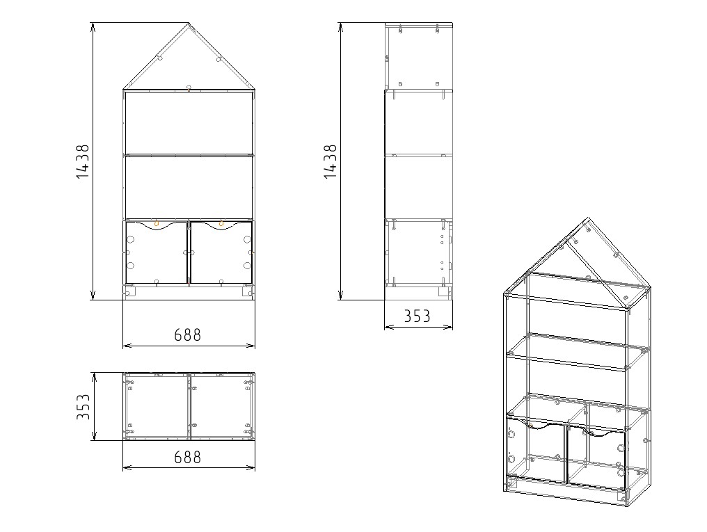 Габариты стеллажа: высота 1438, глубина 350, ширина 688 мм