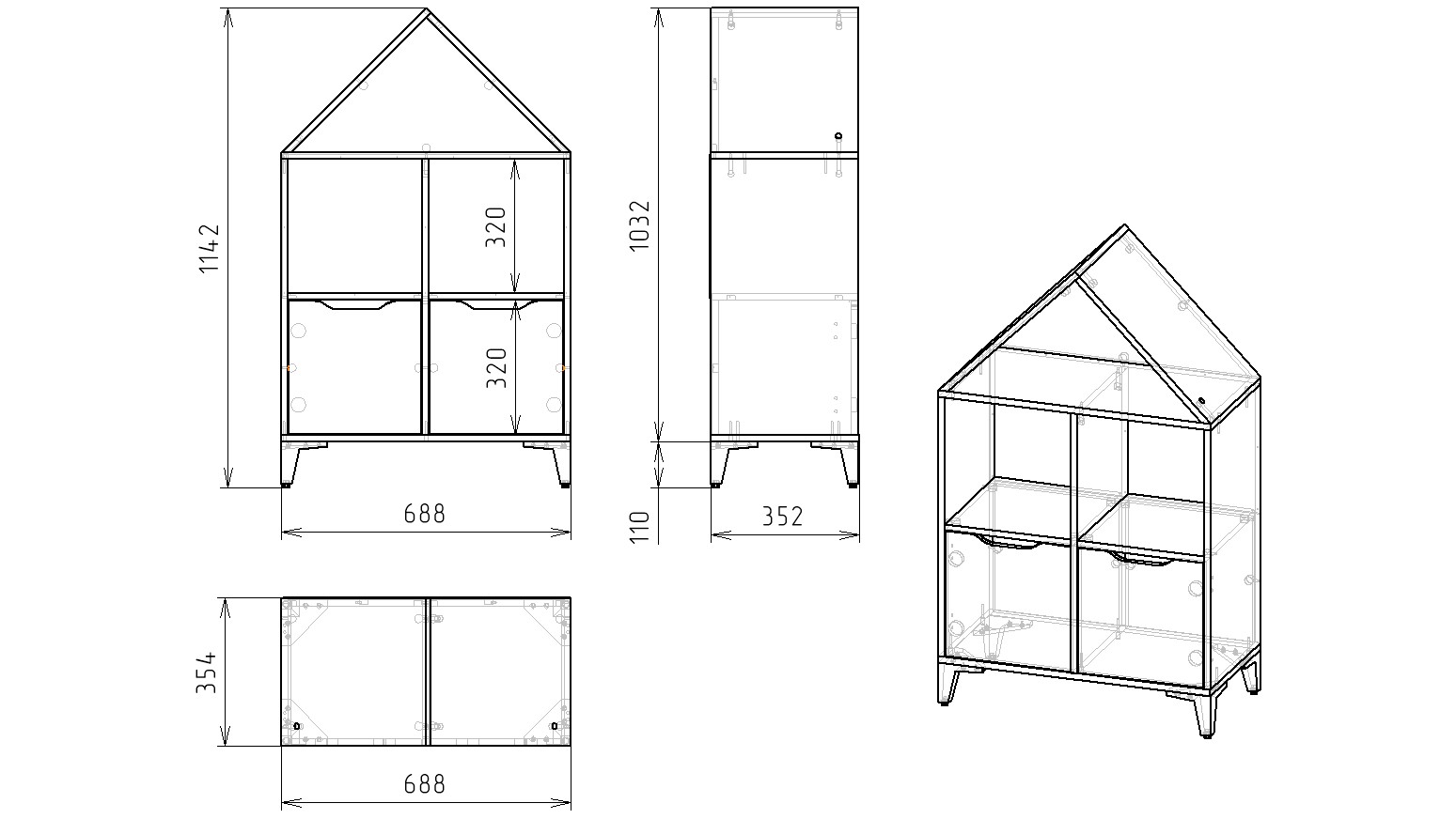 Габариты стеллажа: высота 1142, глубина 354, ширина 688 мм