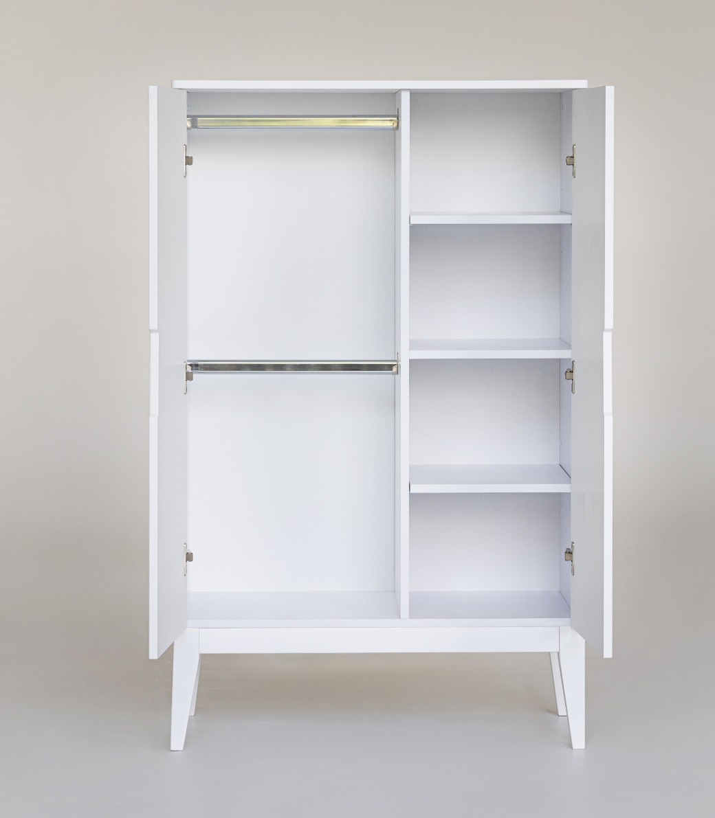 Внутри шкафа есть несколько полок для хранения одежды, а также две штанги для вешалок, чтобы ребенок мог аккуратно разместить свои вещи, легко их находить, сохраняя порядок в своем маленьком мире.