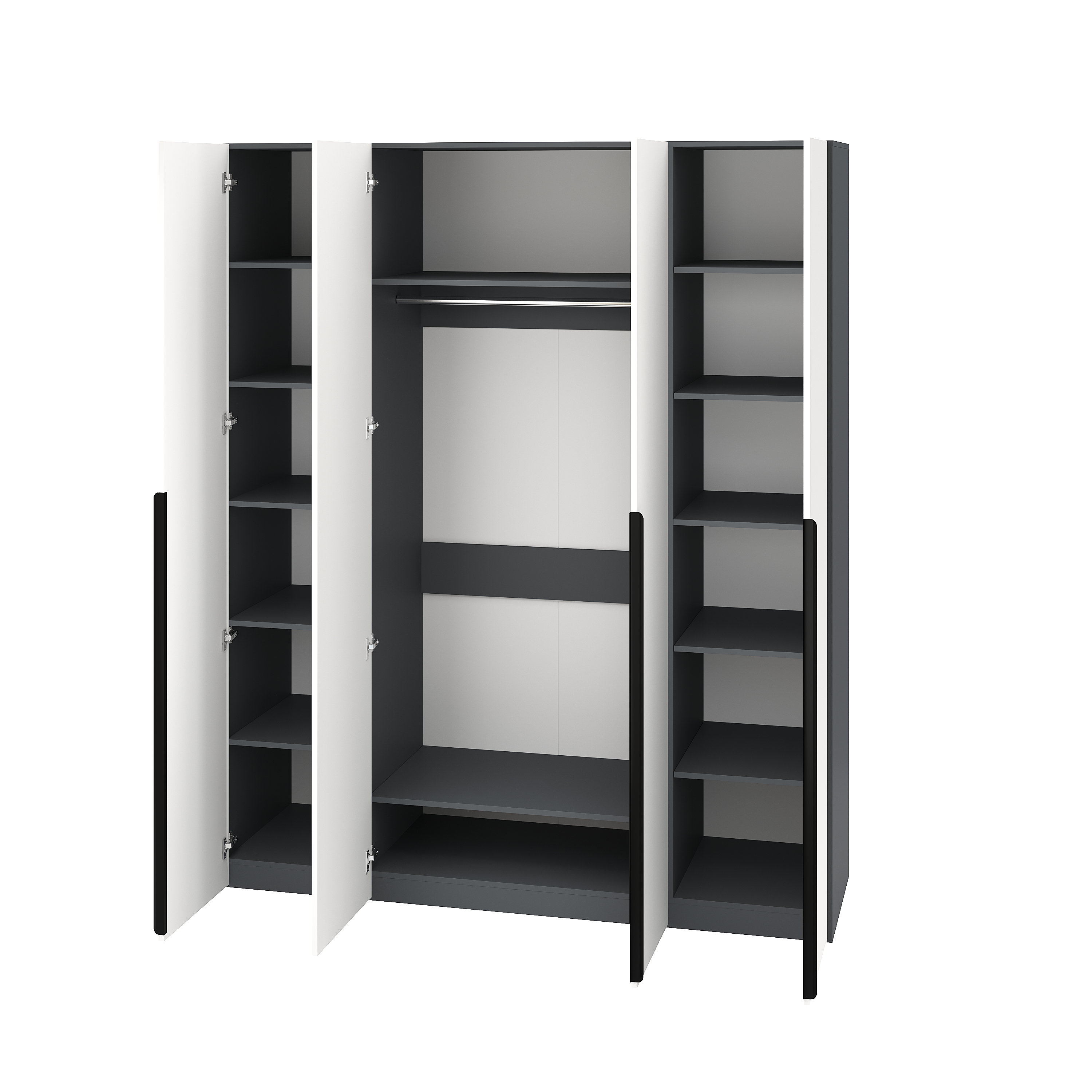 Шкаф имеет четыре распашные двери, которые оснащены доводчиками для плавного и бесшумного закрывания.