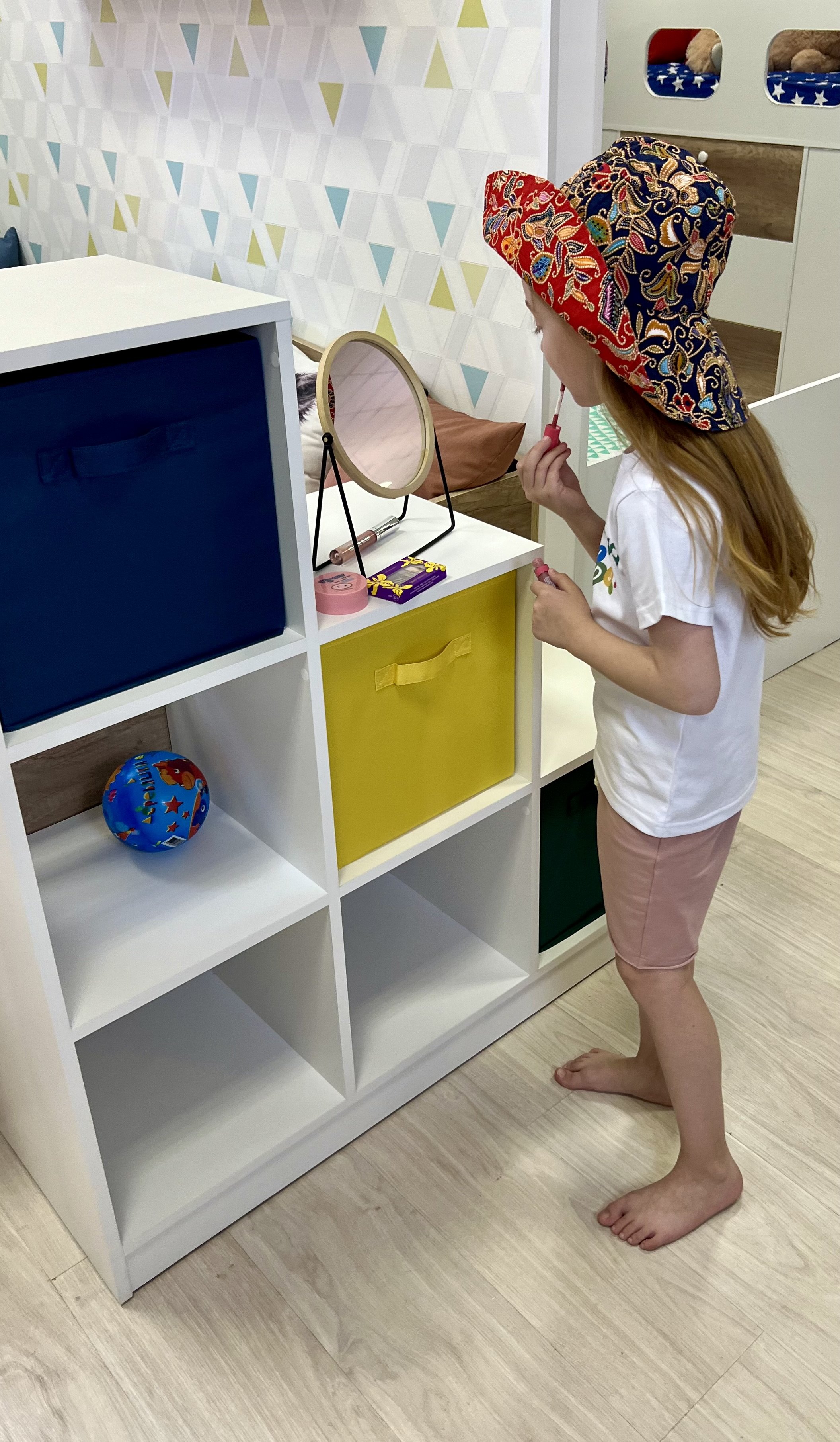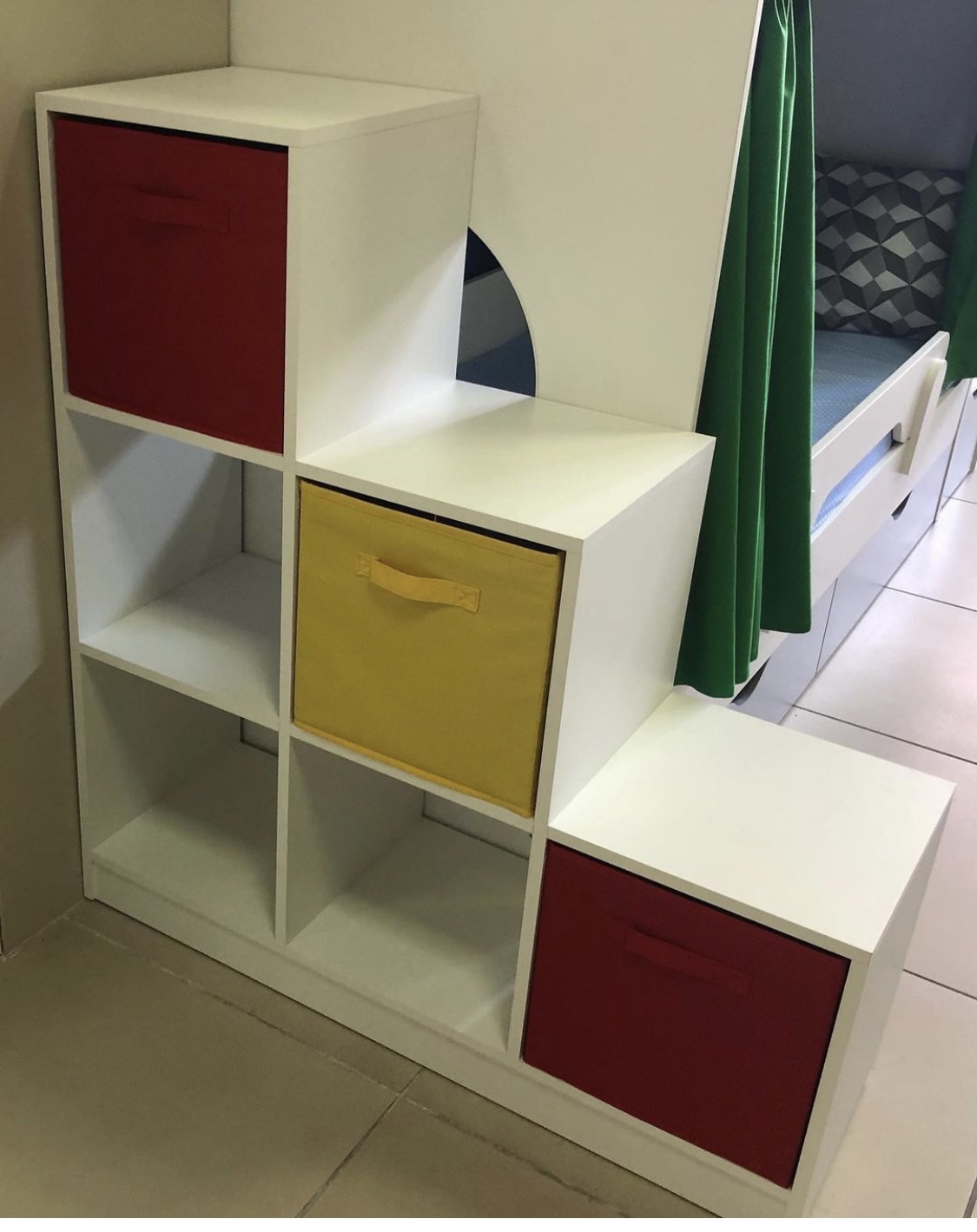 Такой стеллаж станет практичным дополнением в интерьере детской комнаты.