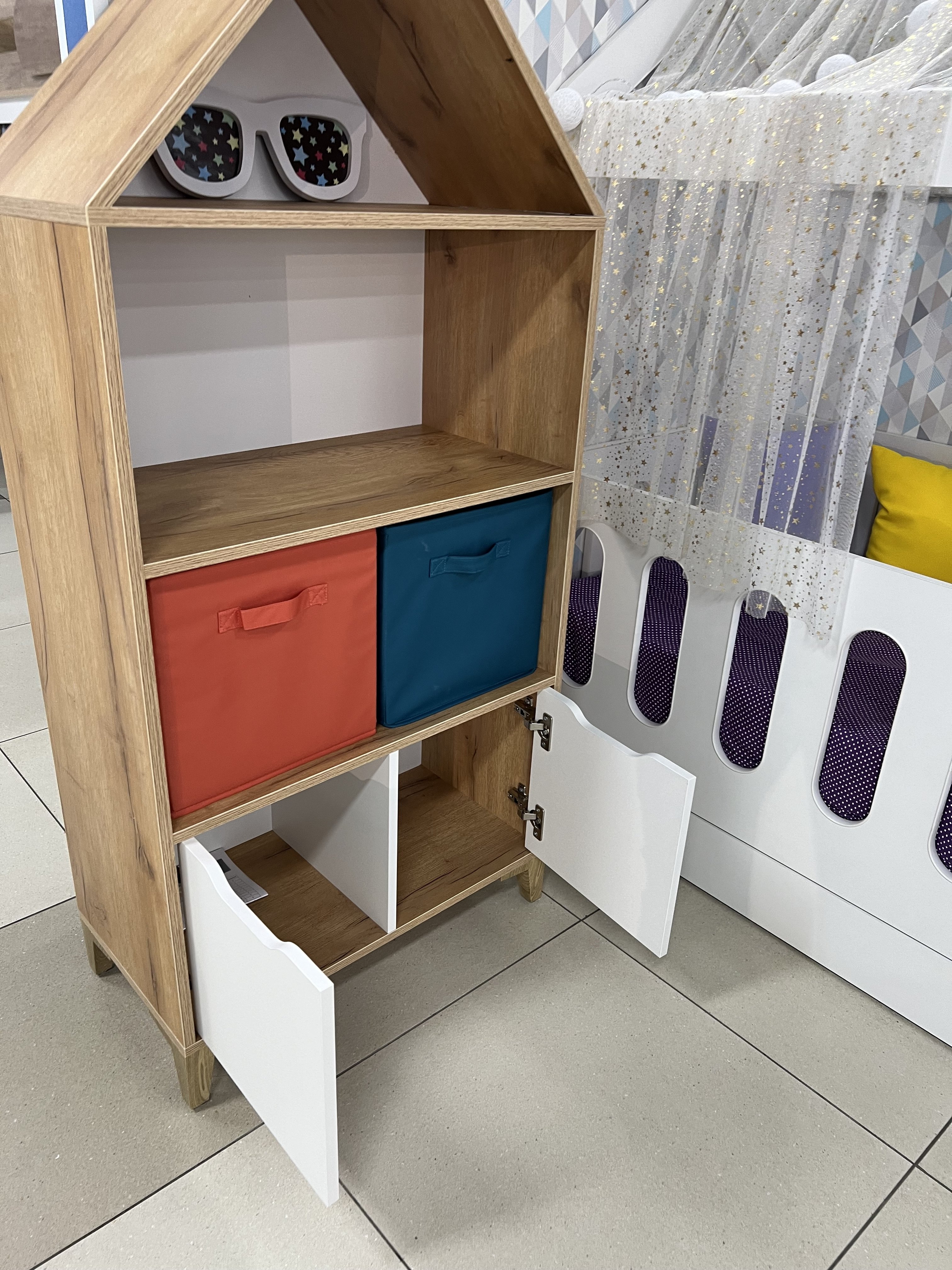 Стеллаж в виде домика - оригинальное и практичное дополнение в интерьере детской комнаты.