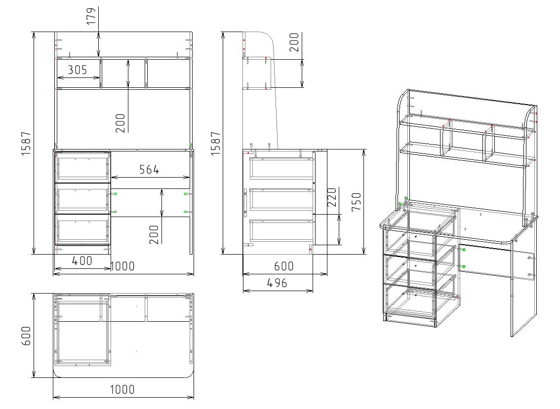 Габариты стола: ширина 1000 х высота 1550 х глубина 600 мм