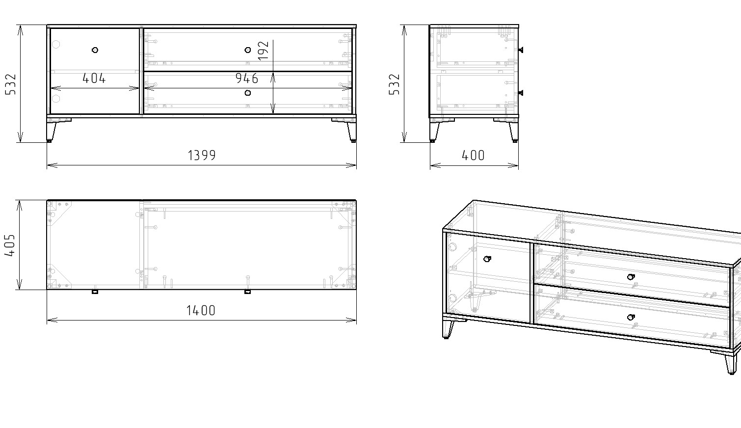 Габариты тумбы: ширина 1400, глубина 405, высота 532 мм