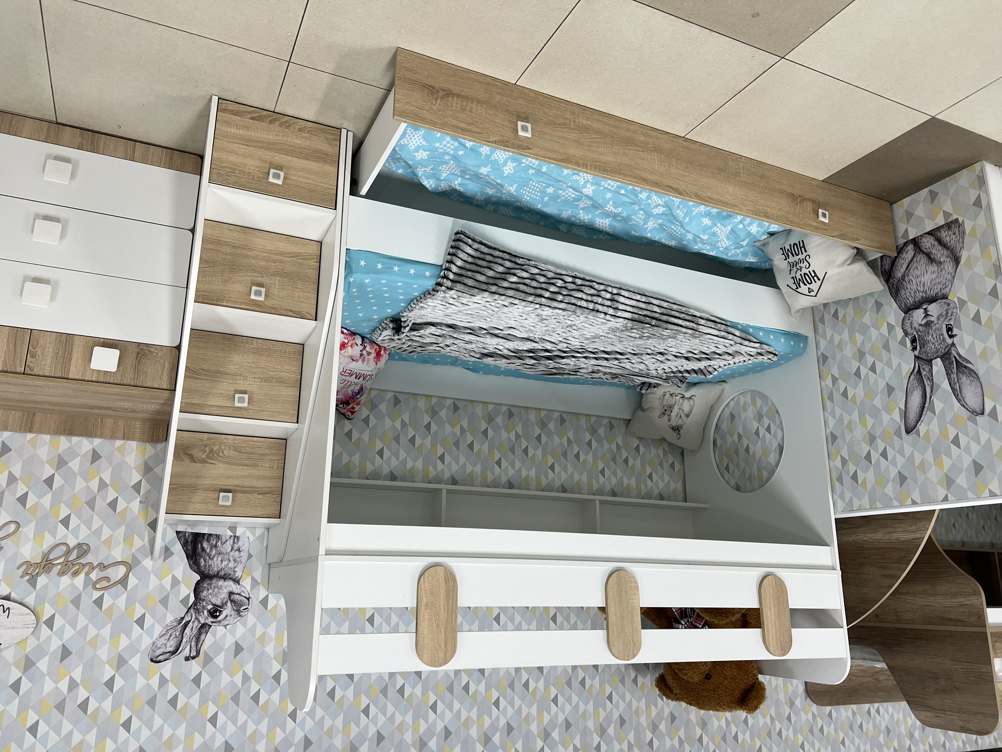Основание кровати – настил ЛДСП, который позволяет ребенку спать на ровной поверхности, что важно для детской спины. Прочное основание не скрипит и не сломается при играх. Отлично подходит как для пружинных, так и беспружинных матрасов.